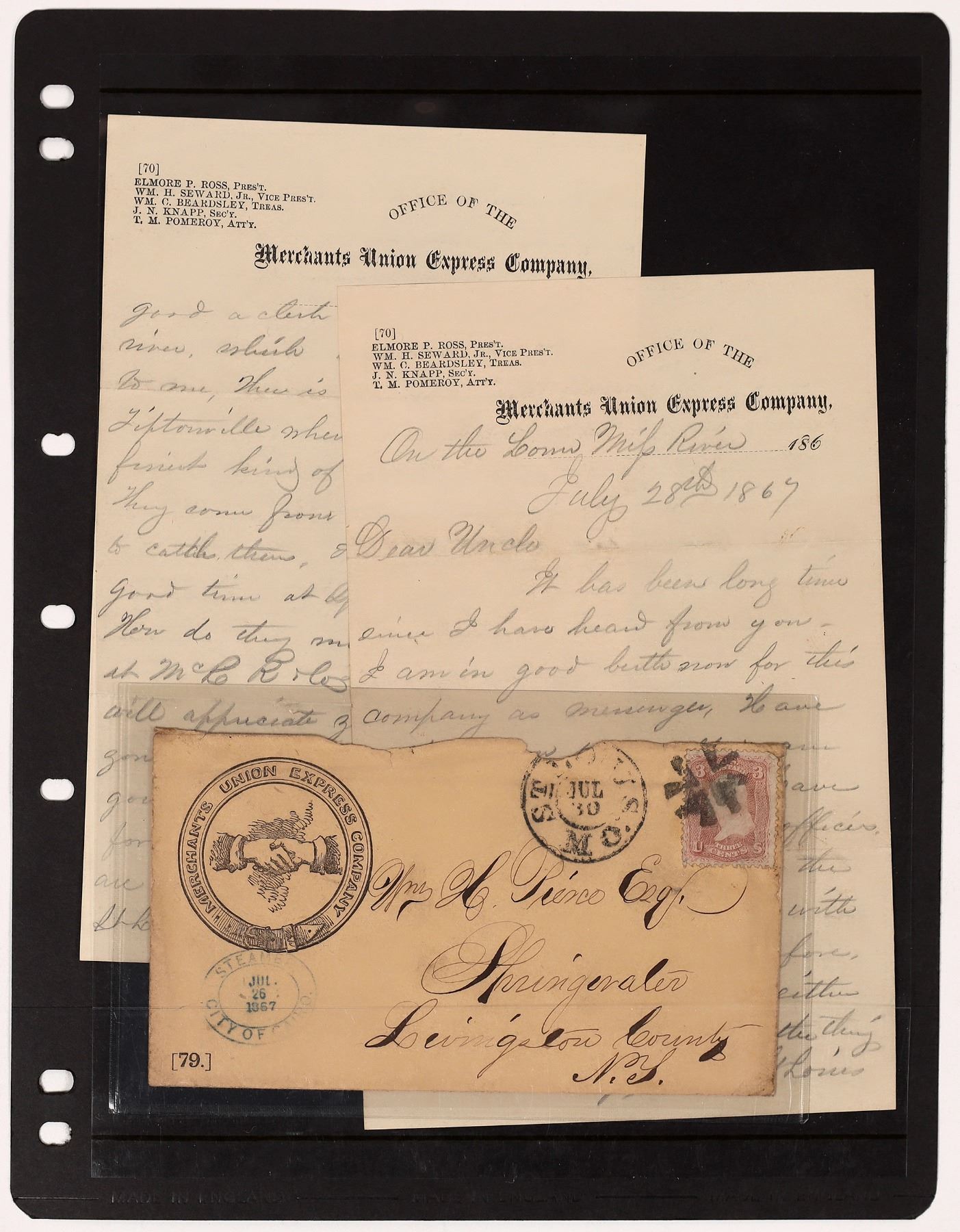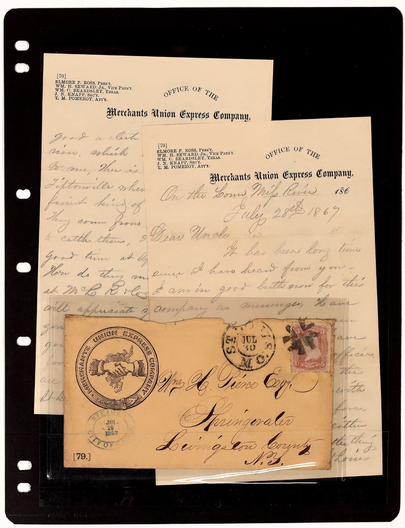 Four page handwritten letter to Wm. H. Pierce from his nephew, on the letterhead of the Merchants Union Express Company dated July 28, 1867. Postal cover has vignette of the Express Company, a St. Louis, M. O. postmark, three cent #97 U. S. Stamp, and July 26 postmark Steamer City of Cairo.