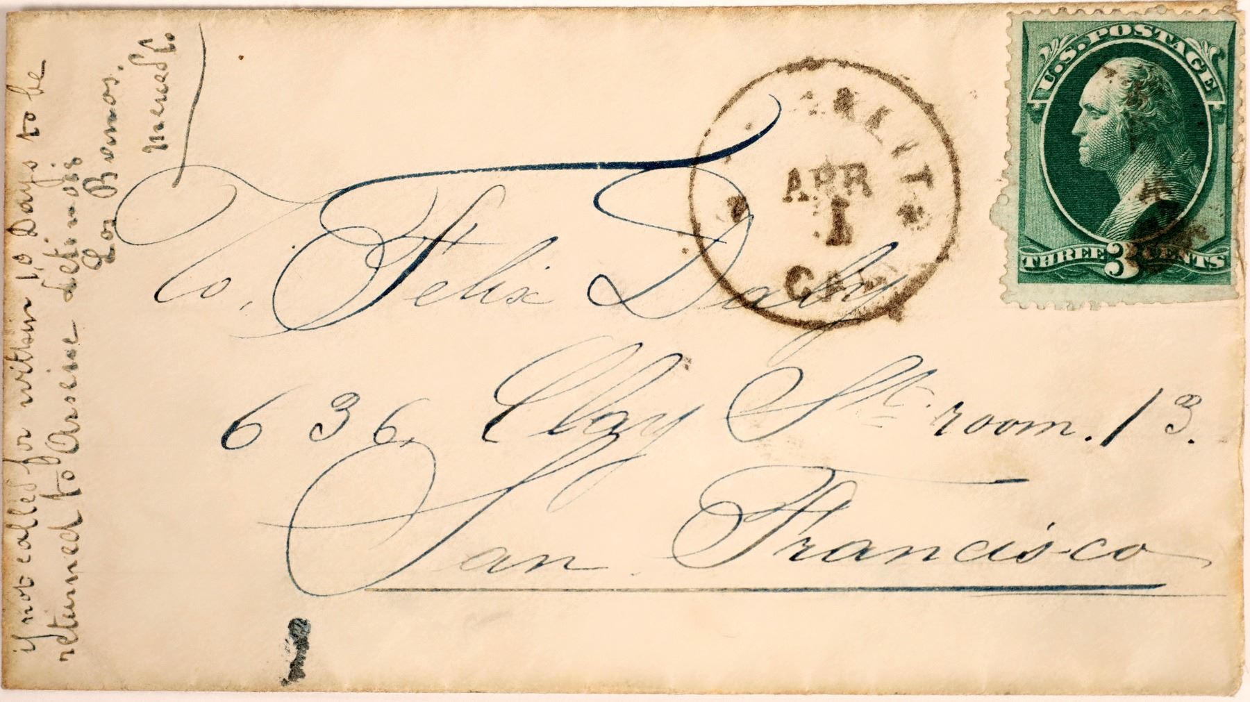 This is an envelope postmarked from Ortigalito, Cal. dated April 1. Only 1876 to 1877. 2 3/4 in. X 4 in. and a Washington 3 cent stamp.
