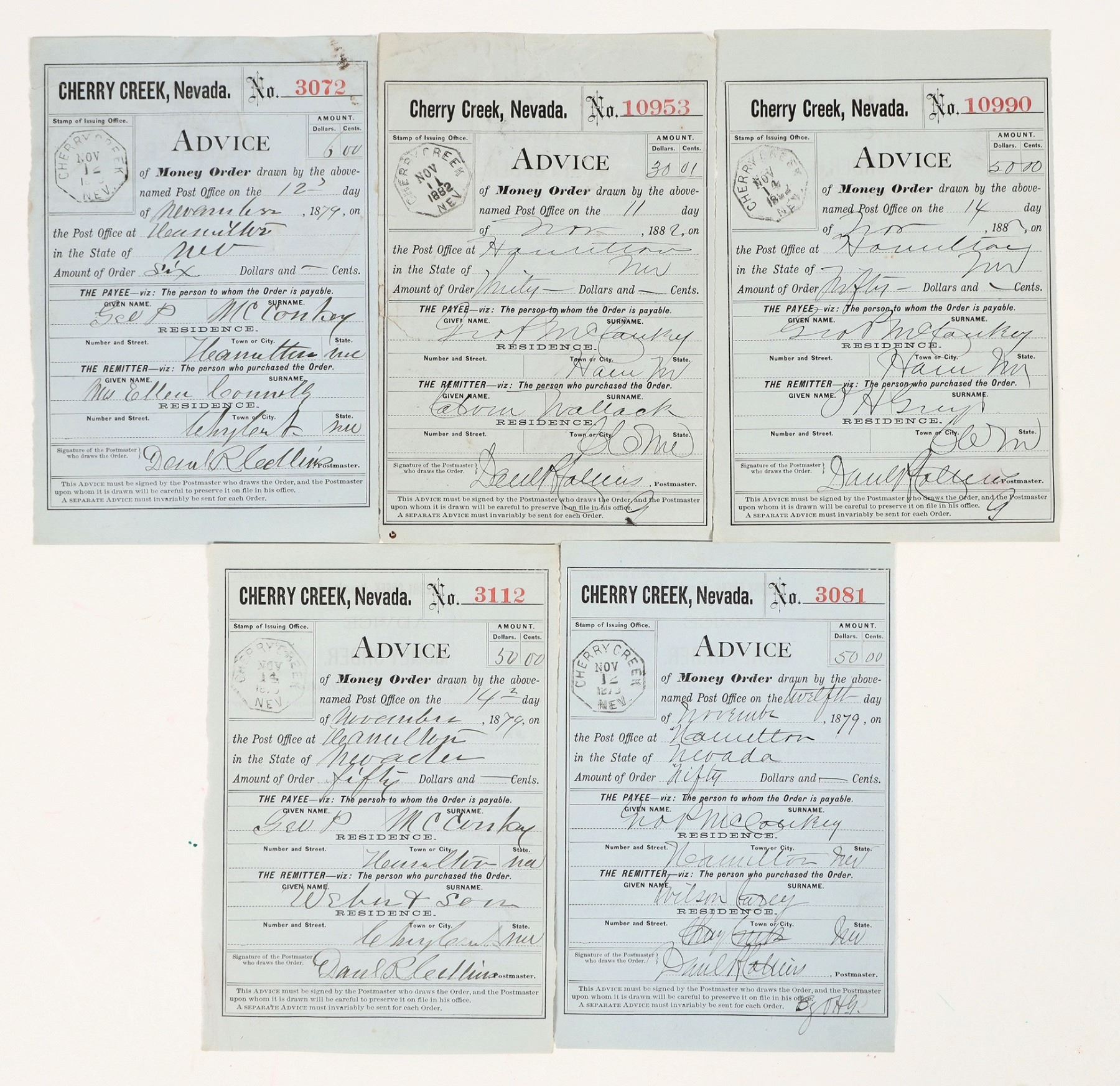 Group of 5. 1879-1882 Postal money order purchase Advice receipts. Cherry Creek and Hamilton.