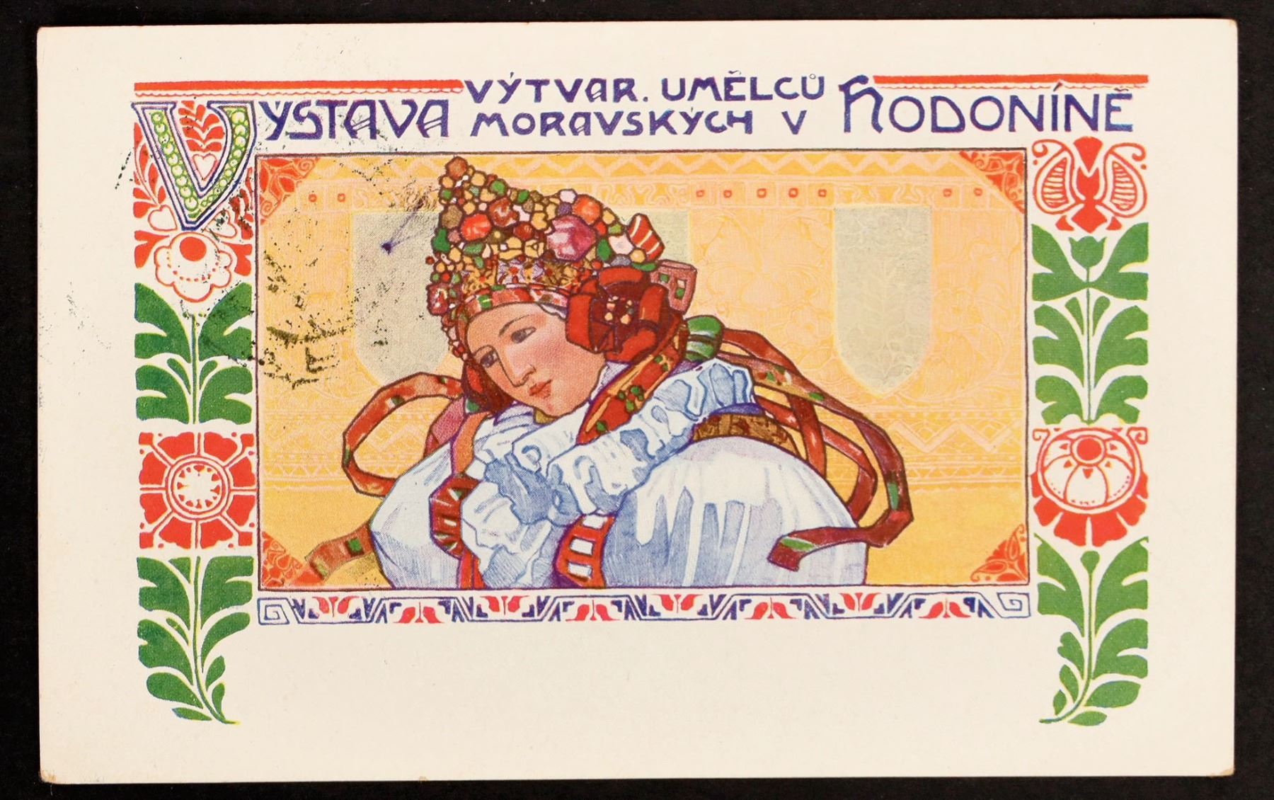 Vintage Color Lithograph Art postcard from the Czech Republic, circa early 1900s. Intricate design by unknown artist of a man in period Czech costume. Titled, "Vystava Vytvar Umelcu Moravskych v Hodonine." Printed "Dopisnice," postmark, stamp and penned writing on verso. Clean.