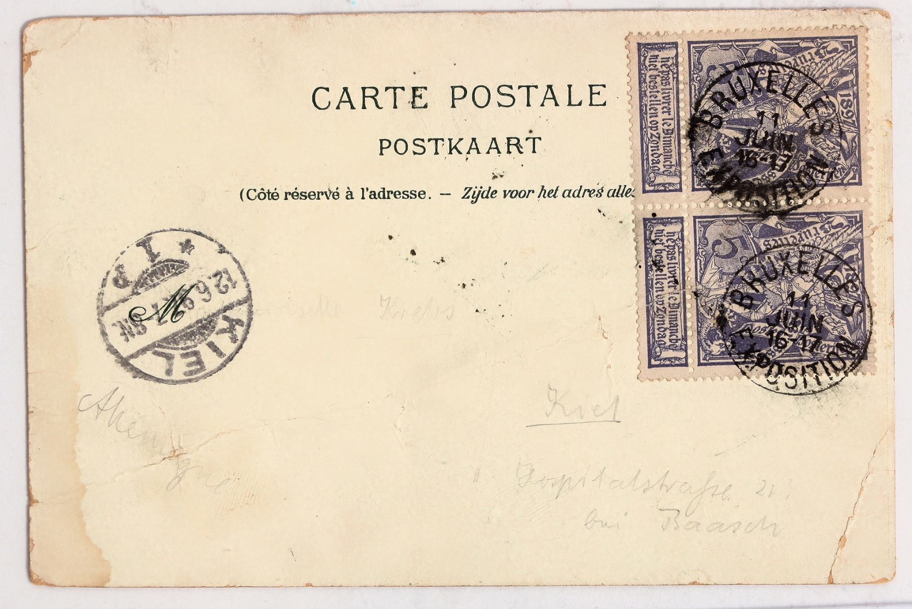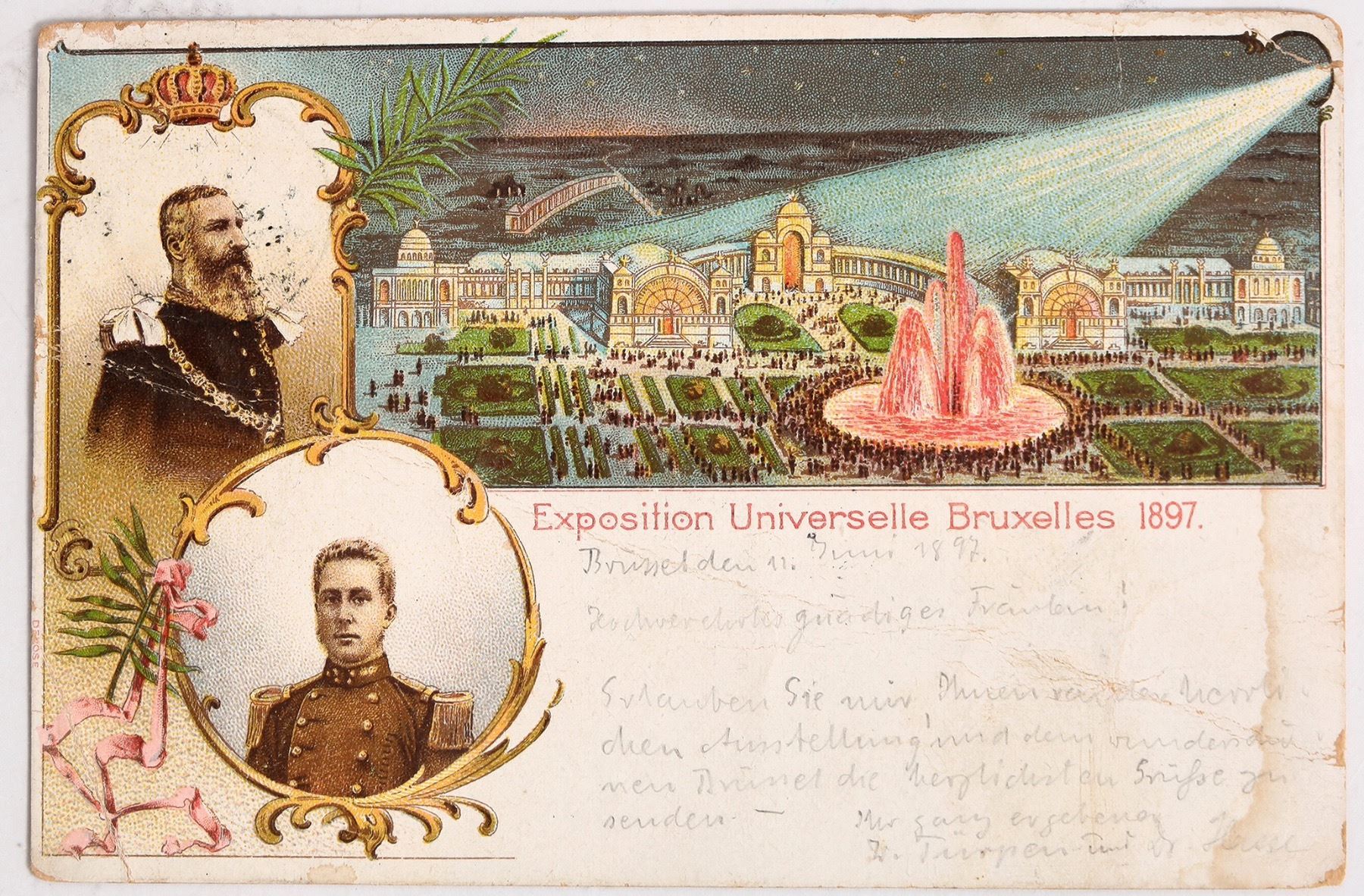 A color litho postcard from Brussels, Belgium, titled "Exposition Universelle Bruxelles 1897." Two stamps with Bruxelles Exposition postmarks, plus a Kiel postmark. Pencilled writing on front and verso. Staining right edge.[ Belgium