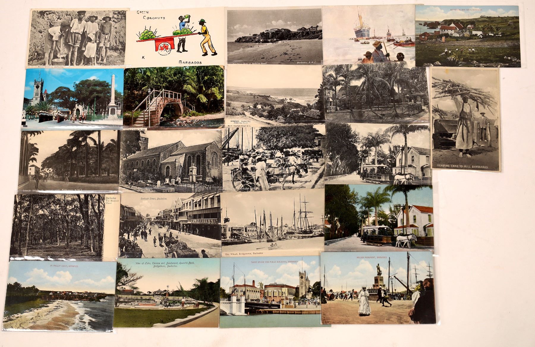 Lot of over 20 vintage postcards of scenes from Barbados in the early 20th century. Street scenes with horse and buggies; the Nelson Monument; Native children and harvesting sugar cane.