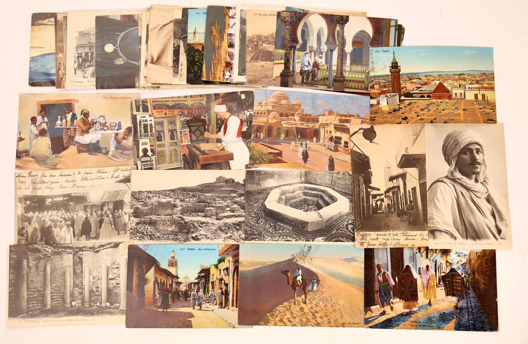 Lot of over 45 vintage postcards from Tunis, Carthage and other sites. Most black and white, some colorized. Street scenes, portraits of local people.