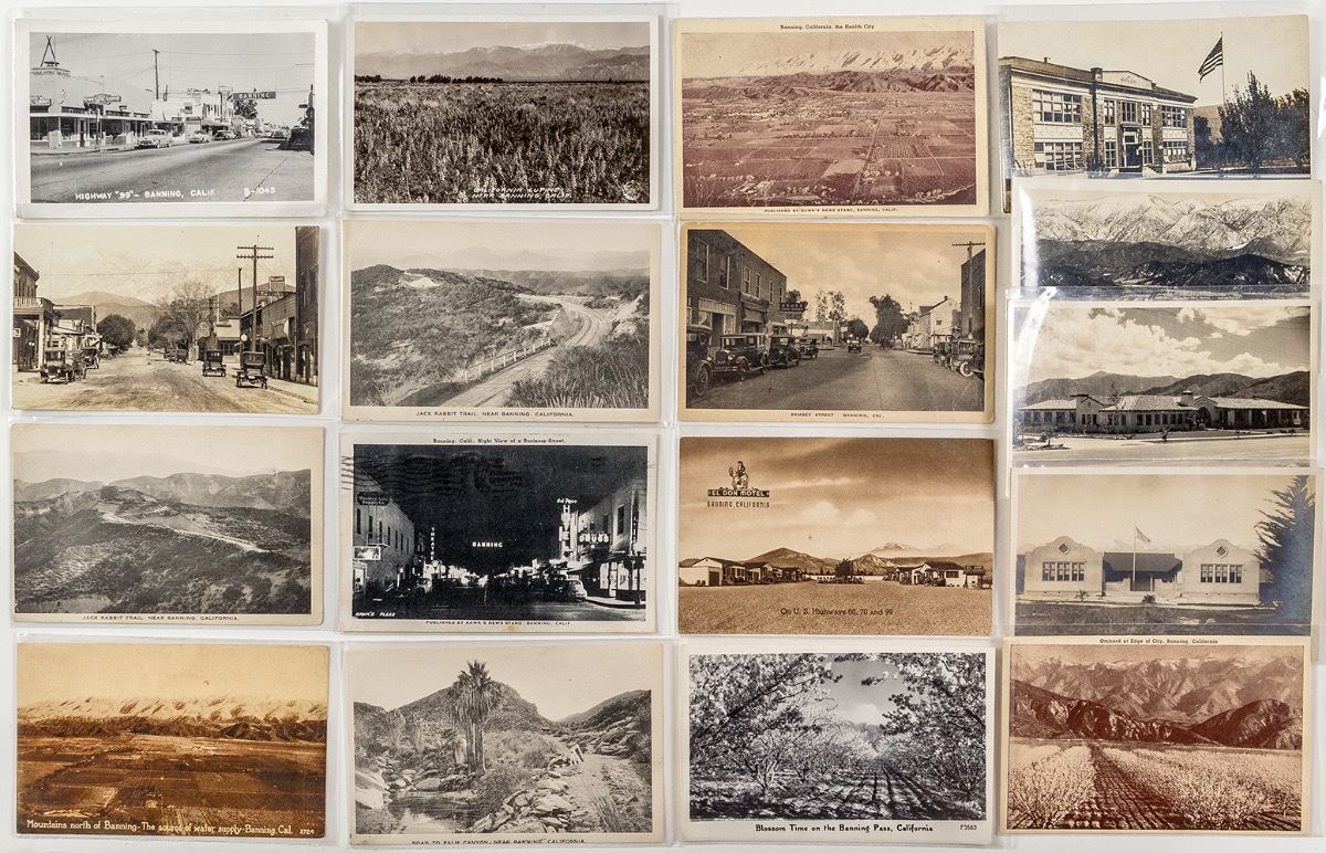 16 Postcards. Street scenes, high school, Water District, bird's eye views, nighttime, Ramsey Street, El Don Motel, Jack rabbit Trail, scenery, old high school, etc. 2 RPC's, 1 nice street scene from the late 1940's, 1 c1920, 5 post 1940 RPC's, and 8 post 1940. (Prag collection) City: Banning State: California Date: ID# 31106