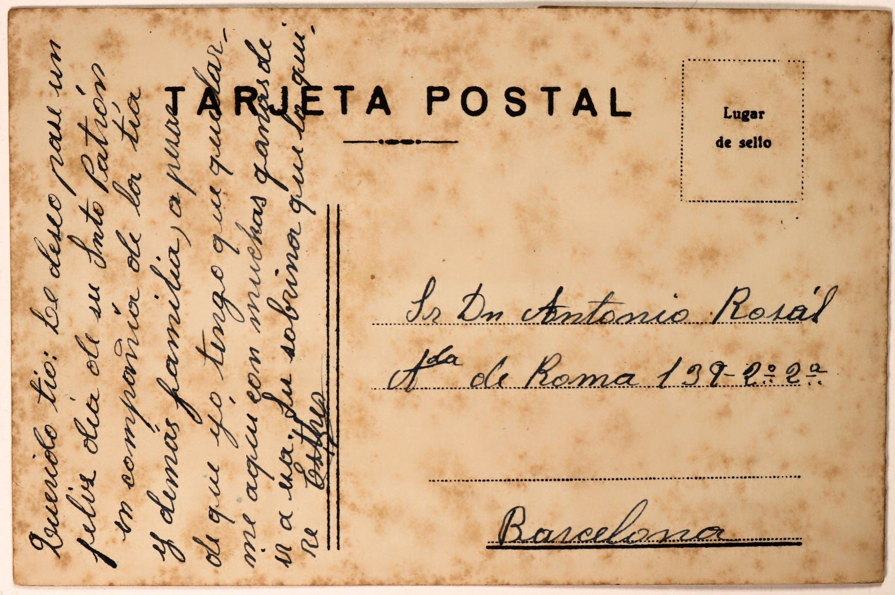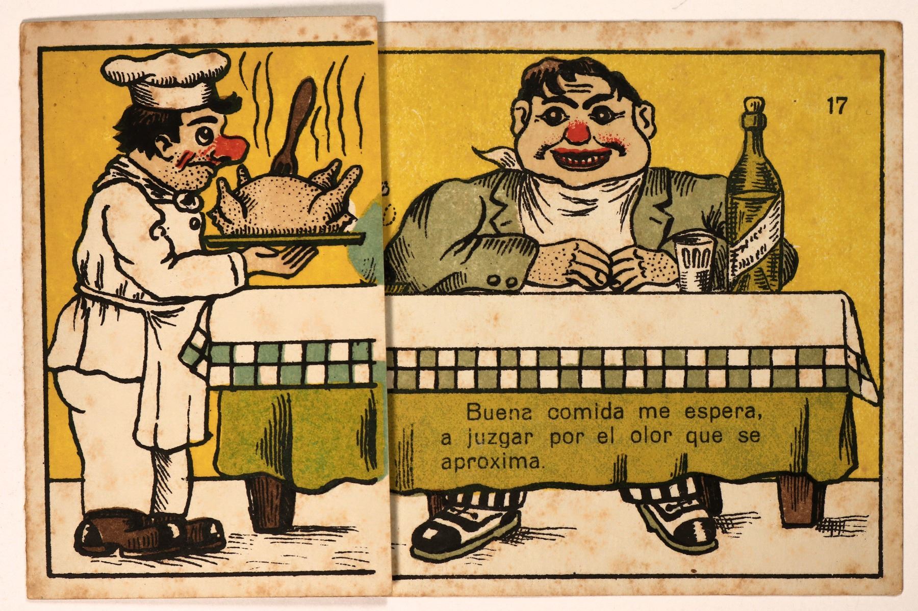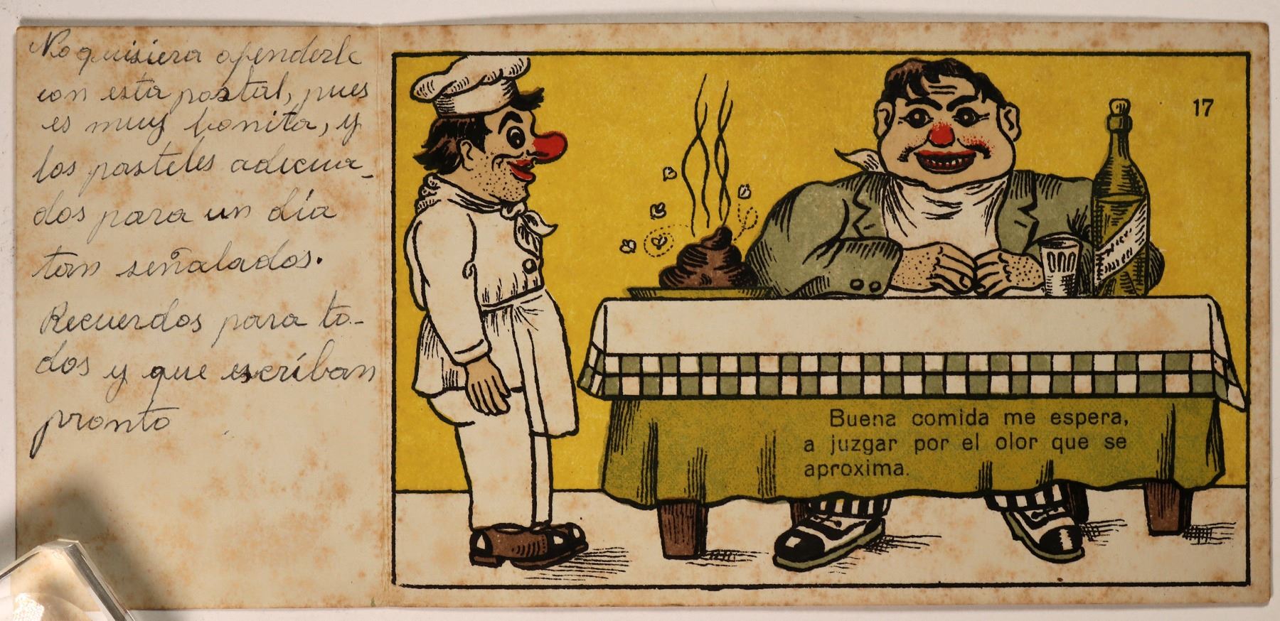 A humorous folding postcard with the words, "Buena comida me espera a juzgar por el olor que se aproxima" on front. Translated to English: Good food awaits me judging by the smell approaching. Used, addressed to Barcelona, with penned writing on verso. No stamp or cancel. From the early 1900s.[ Spain