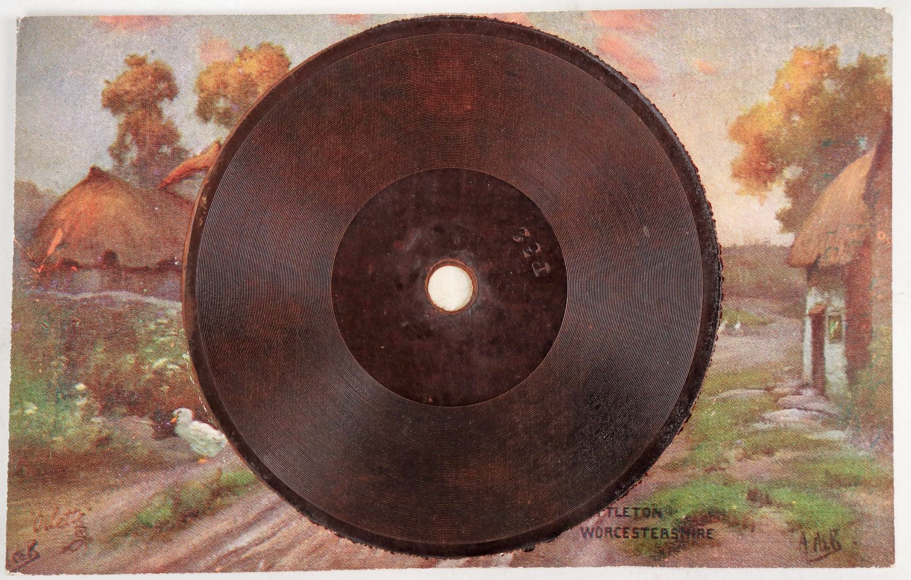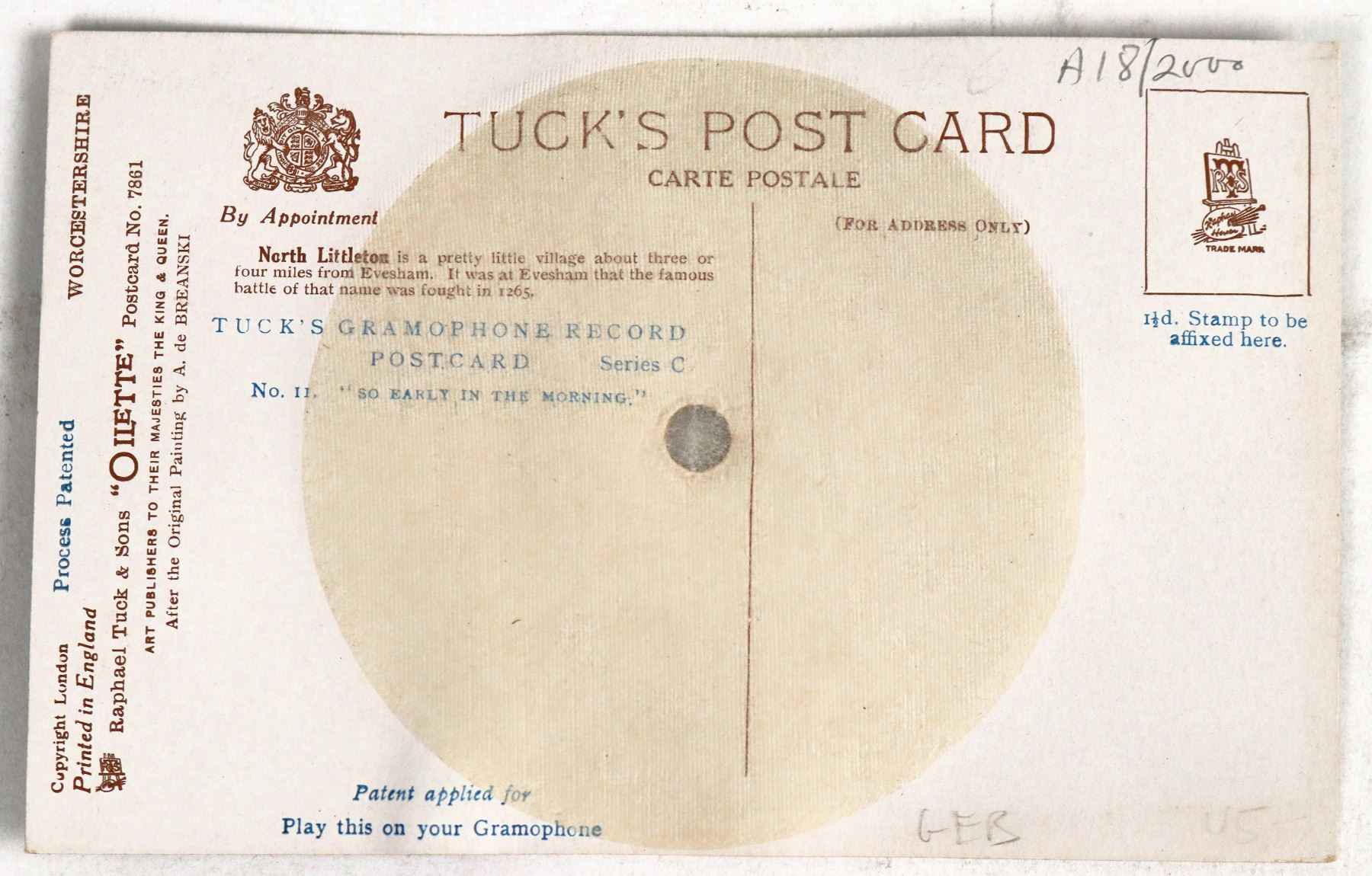 A RARE phonograph record postcard, Tuck's Gramophone Record Postcard, Series C, No. 11. "So Early in the Morning." Circa 1930s. "Copyright London Worcestershire, Printed in England, Raphael Tuck & Sons 'Oilette' Postcard No. 7861, Art Publishers to their Majesties the King & Queen. After the Original Painting by A. de Breanski."[ United Kingdom