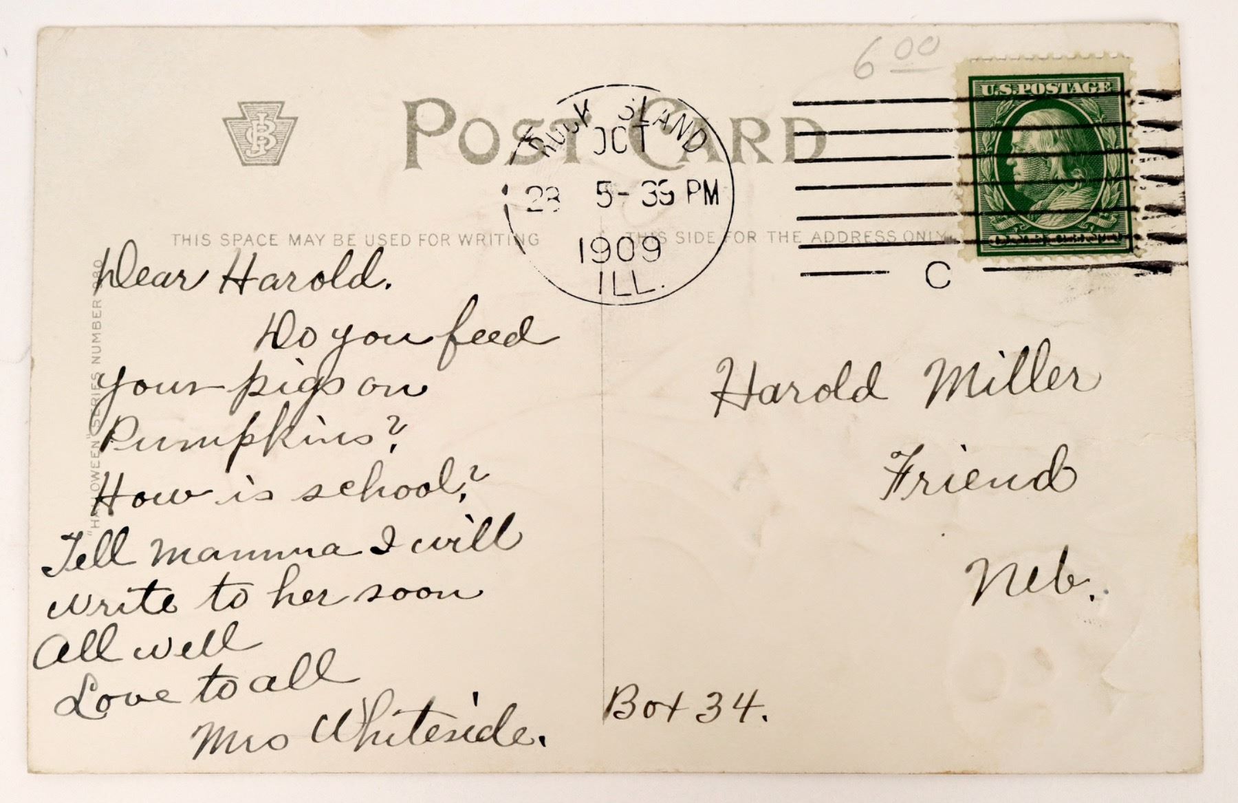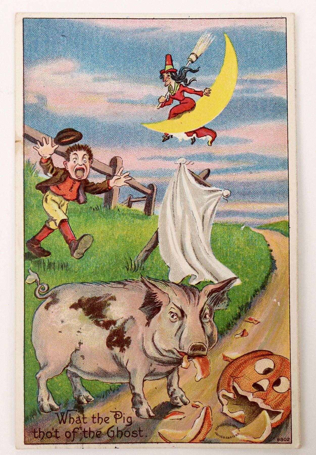 Color lithograph Halloween postcard of a pig eating a jack-o-lantern, caption, "What the Pig tho't of the Ghost." Witch on broom sitting on the moon. Embossed. Postmark Rock Island, Ill., 1909.[ Rock Island Illinois