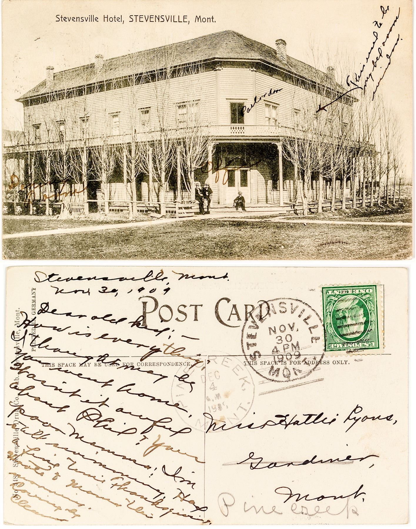Nice black and white photo of the Stevensville Hotel. Hand written notes on fronts include "parlor door" and "This used to be my bedroom window." The Pine Creek cancel (1904-1914) is a forwarding cancel. Sent from Stevensville. Includes a one cent stamp.