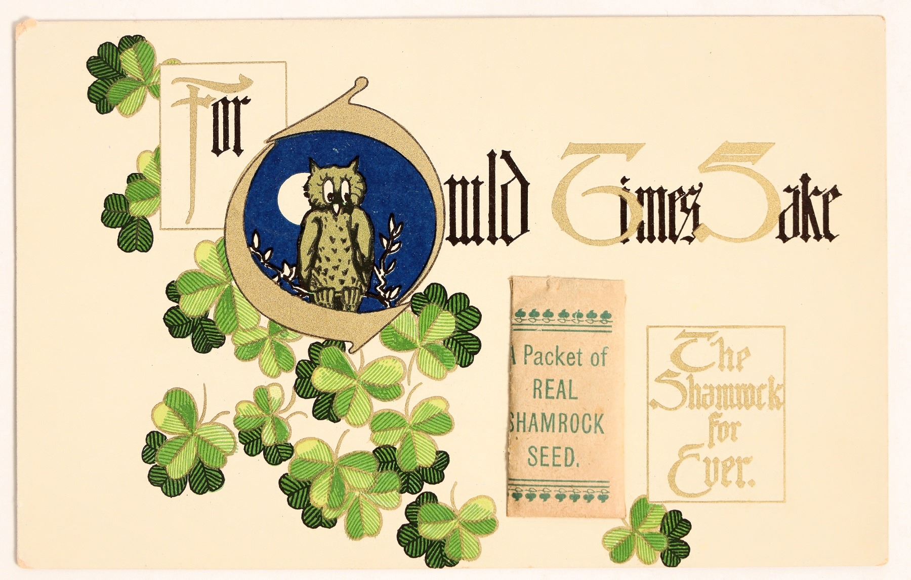 Postcard reads, "For Owld Times Sake, The Shamrock for Ever" with gold gilt illustration of an owl and shamrocks and a packet of real shamrock seeds. Unused with penned writing on verso. From the "National Series," Great Britain.