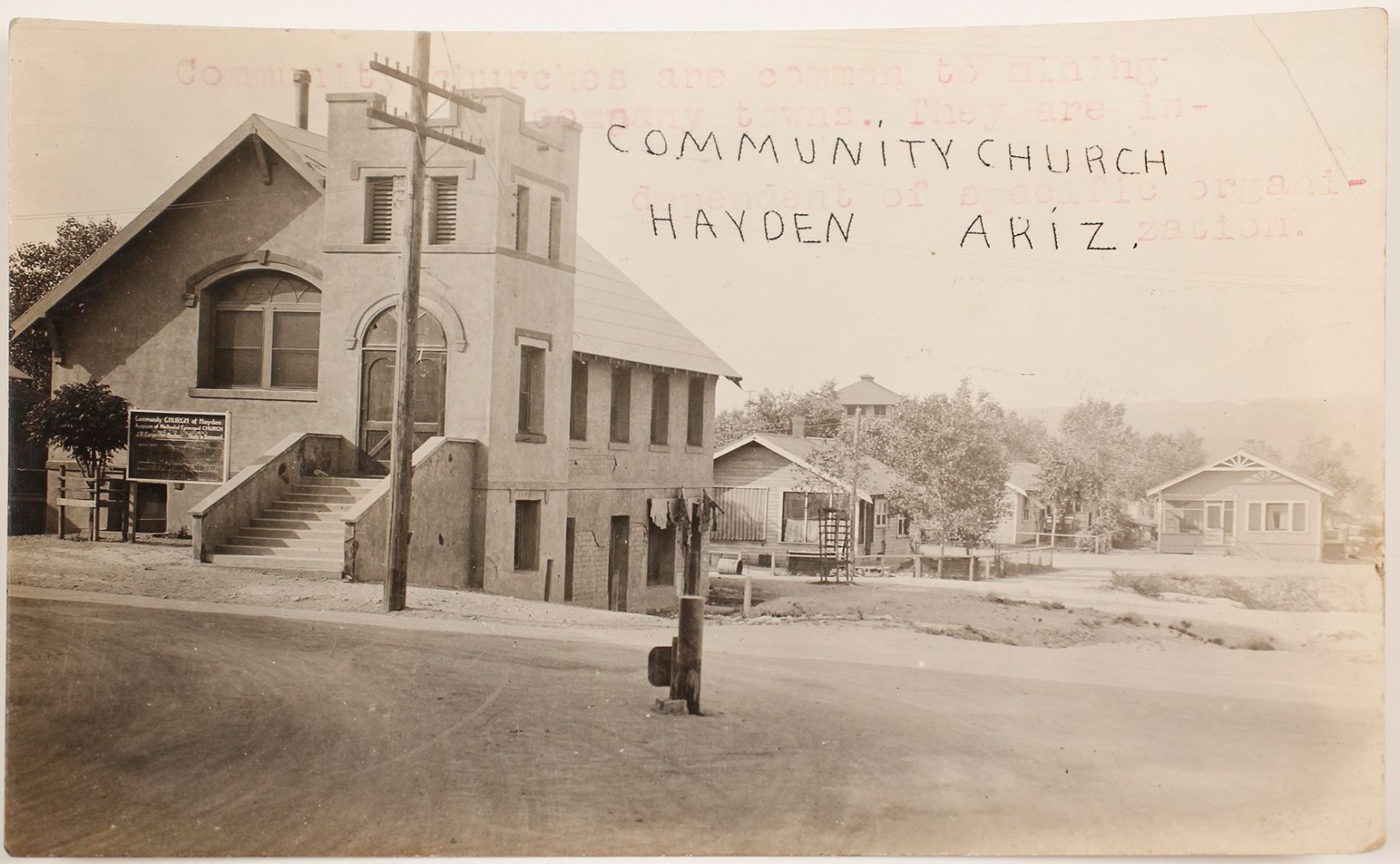 This postcard show the Community church of Hayden. No postmark or photographer identified. Date: Location: Hayden, Arizona HWAC# 63828