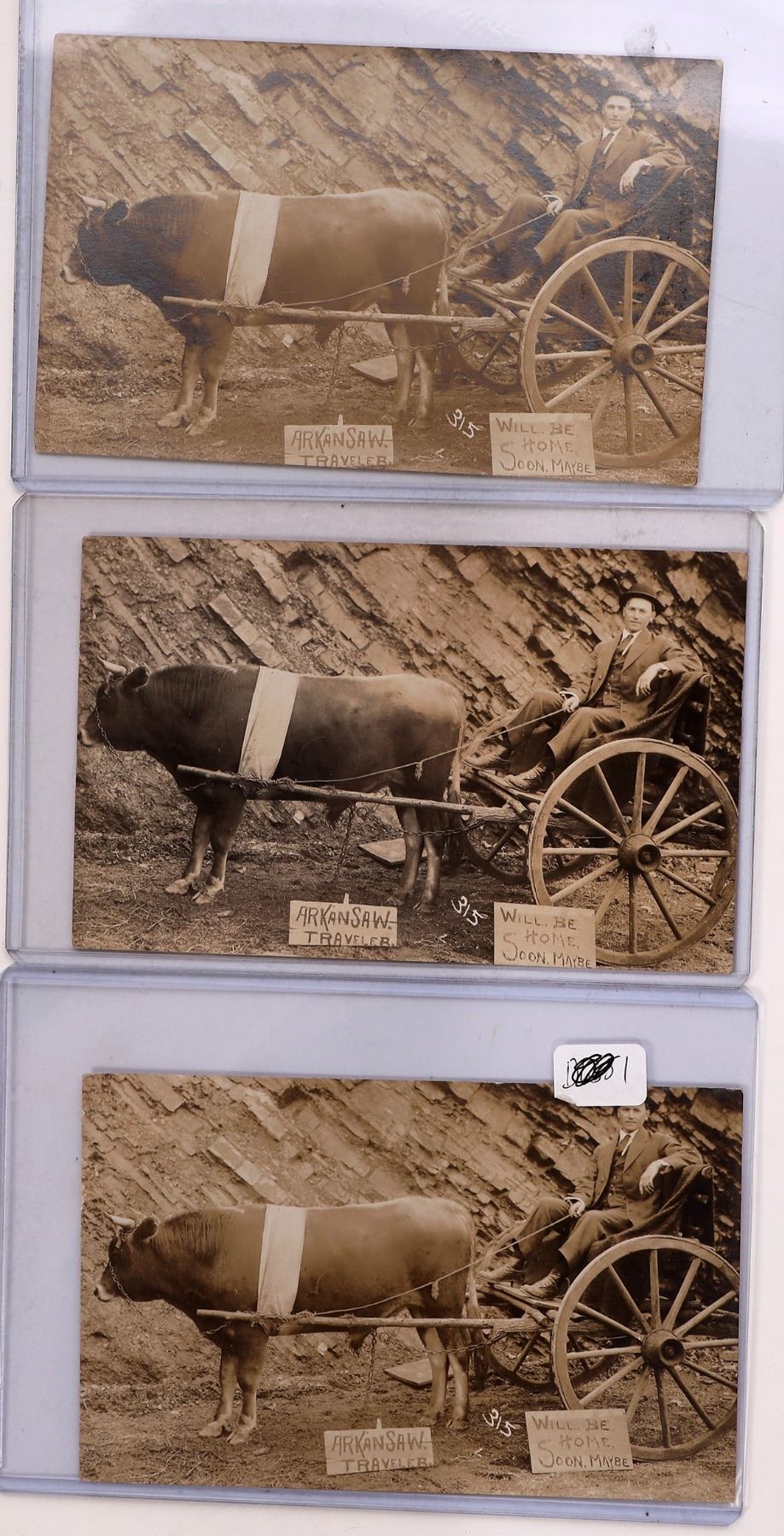 A group of 3 of the same RPC postcard depicting a man in suit and bowler hat aboard a cart pulled by a cow, with the signs "Arkansaw. Traveler." and "Will Be Home. Soon. Maybe." in front of it. Unused. Light foxing on verso on one, otherwise clean.
