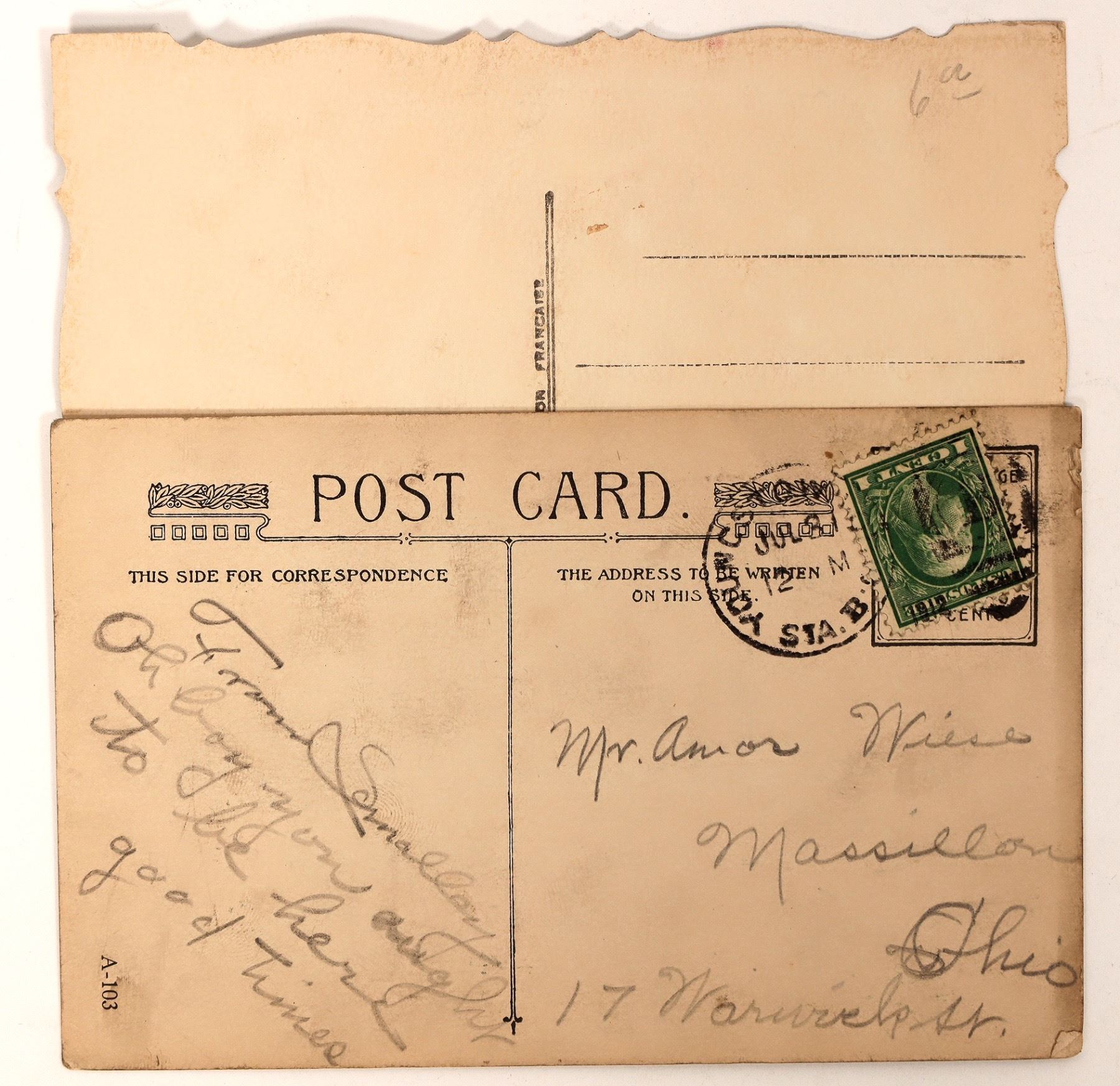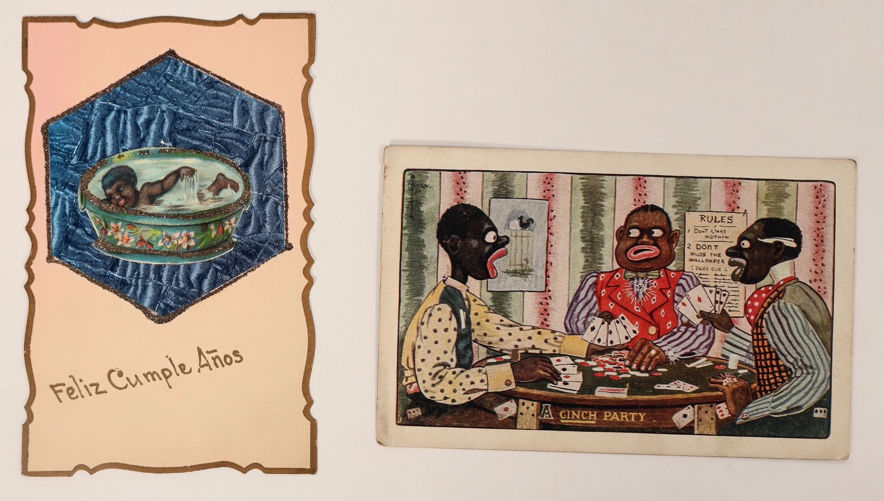 Pair of postcards featuring now politically incorrect black caricatures, c1912. One postmarked, the other unused.[