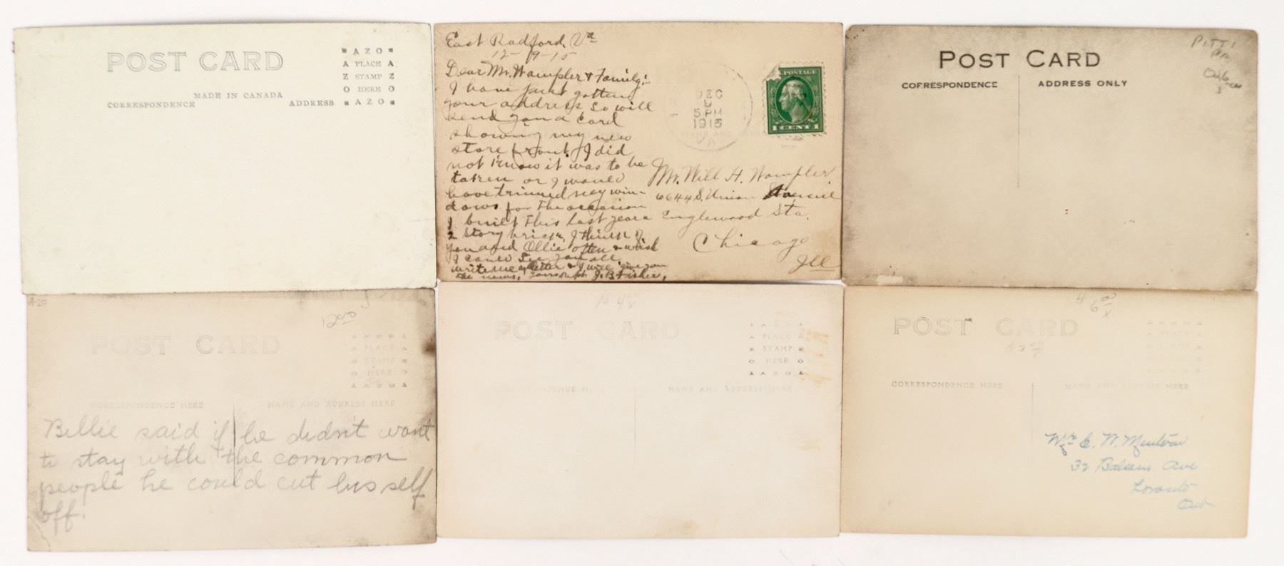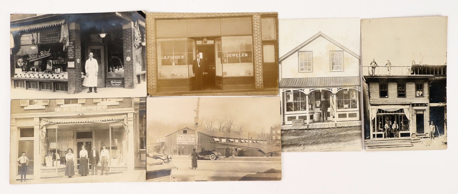 Collection of 6 postcards, black and white photos of business exteriors, c1910s. One previously used, East Radford, Va., 1915. Others unused. Ice cream, jeweler, church, etc.[