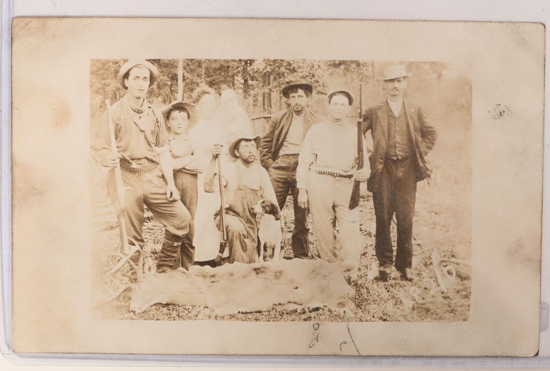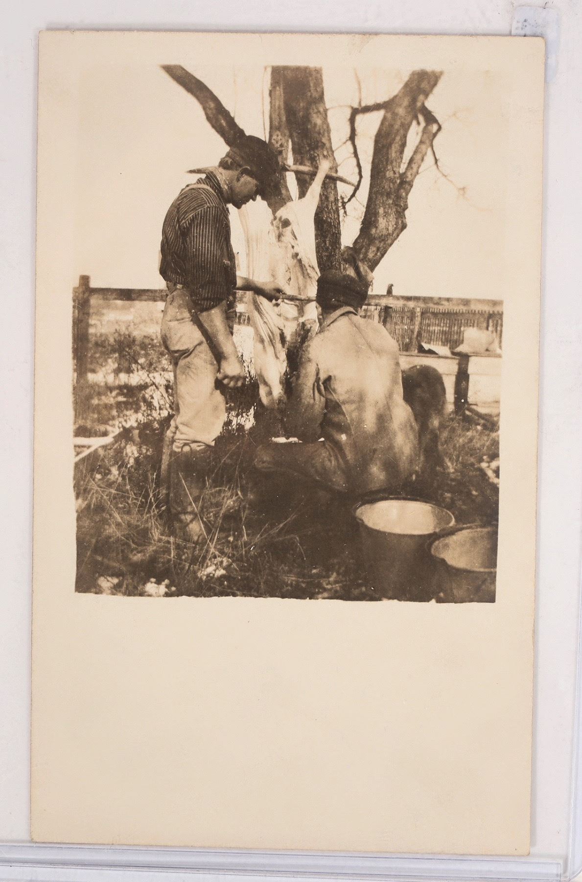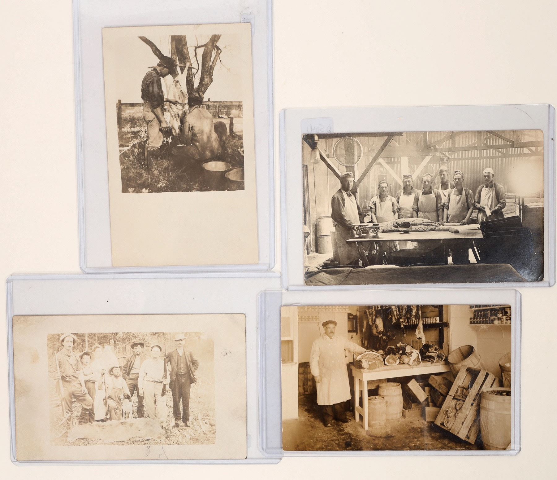 A collection of 4 RPC postcards of the inside of butcher shops, 2 of hunting, c1900-10. Unused.[