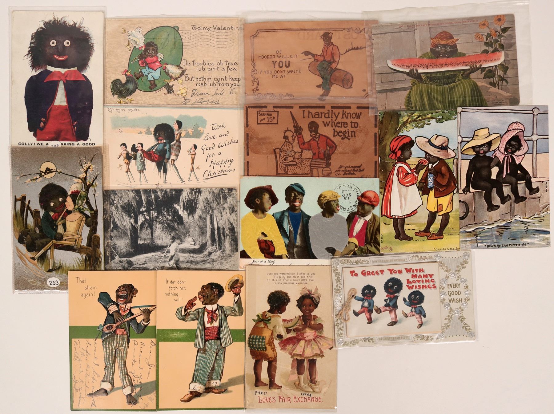 Lot includes four very colorful Tucks postcards. One of the Tucks cards is signed E. Curtis. Includes two signed Ellen Clapsaddle with cute imagery. Two leather postcards in fair condition. Includes one real photo postcard of road builders in Georgia. See photos.