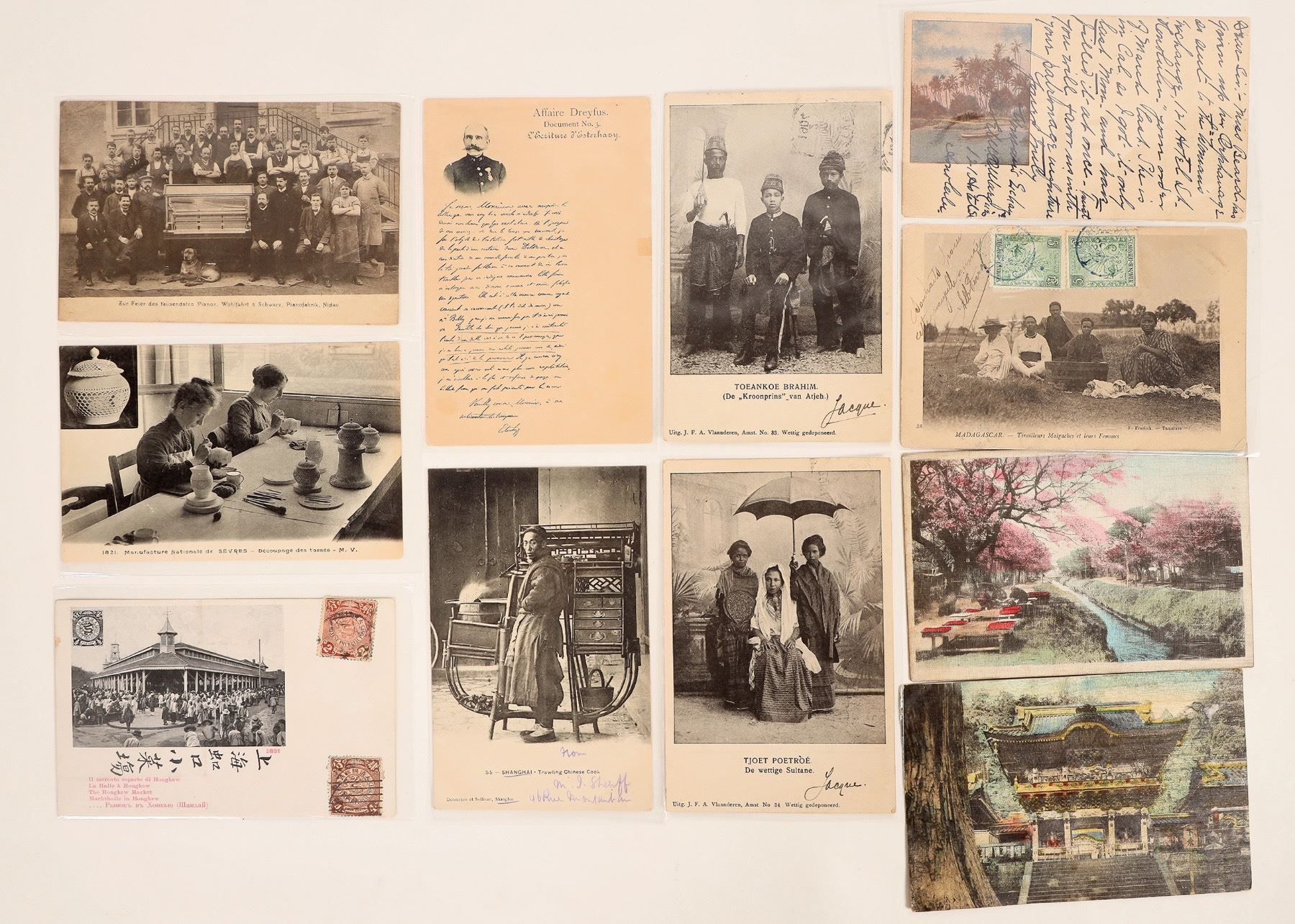 A collection of 11 postcards from foreign countries, c1904-08. 6 postmarked, others unused. Includes a full silk and hand-colored wood postcards. Countries include China, Madagascar, Japan, Switzerland, France, etc.[ Foreign