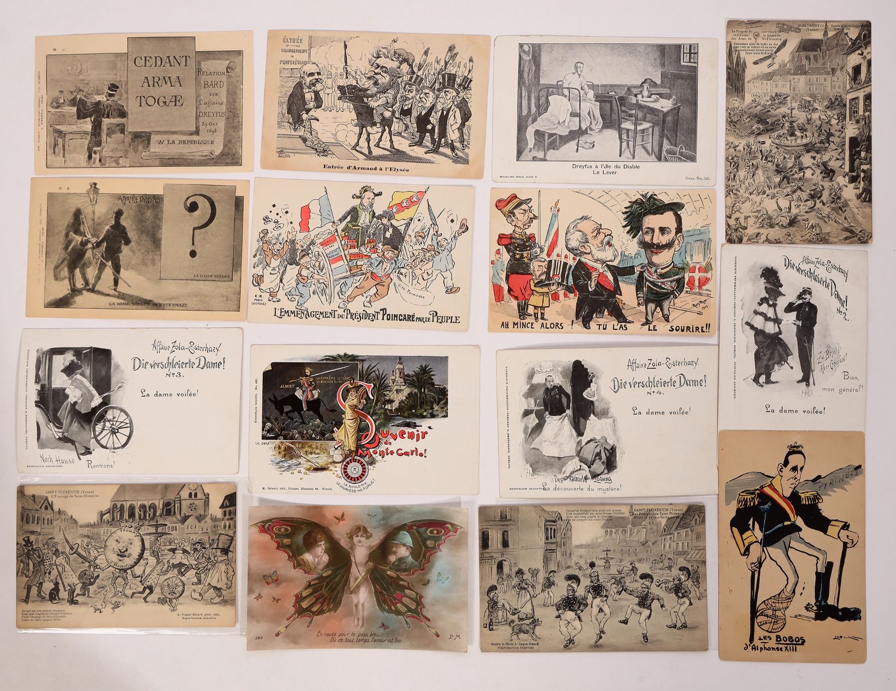 A collection of 14 postcards from France with illustrations depicting political humor, from around the turn of the century. All unused. Light wear on edges, otherwise clean.[ France