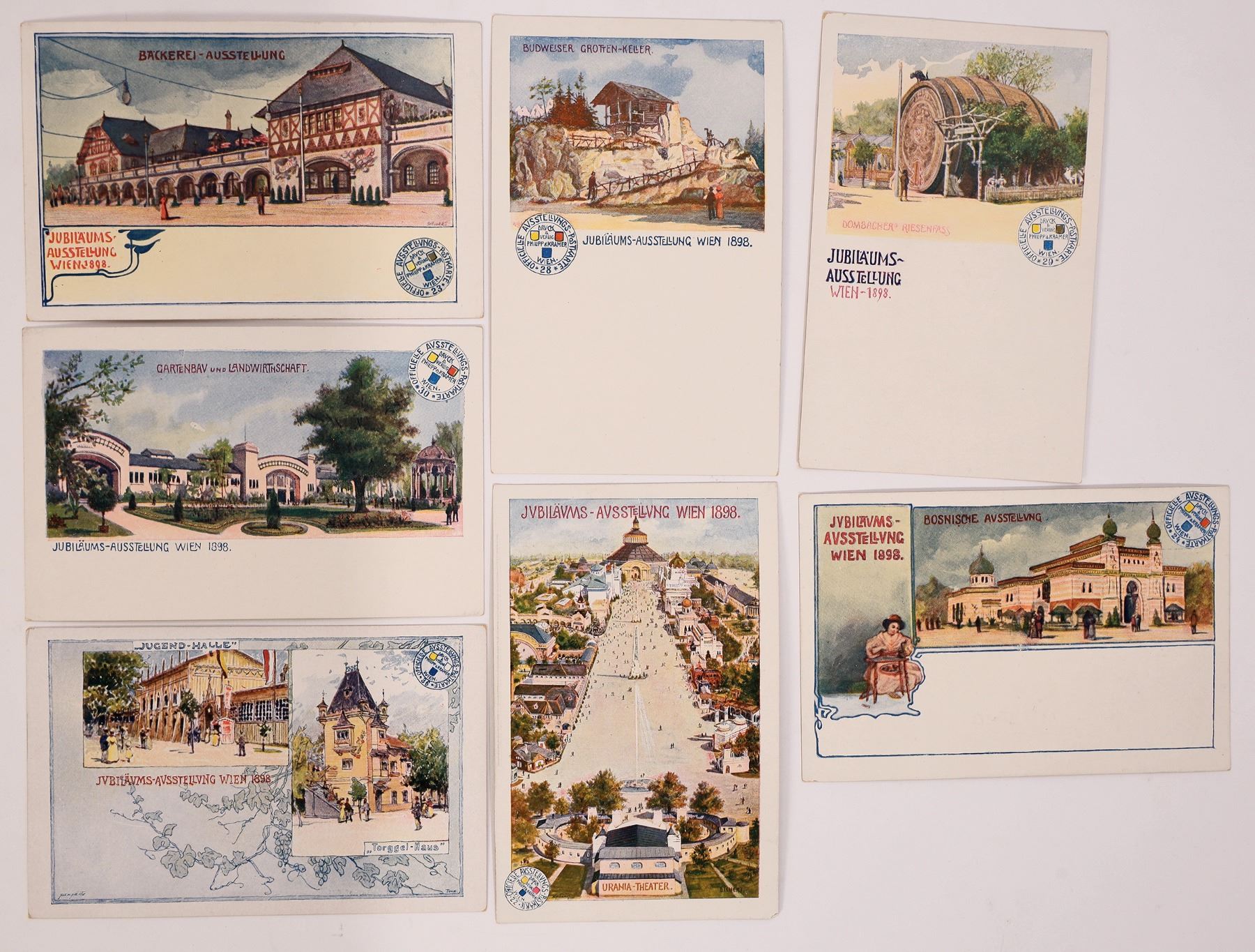 A collection of 7 postcards advertising the German festival, Jubilaums-Aussteilvng Wien 1898. All unused chromolithos, dated 1898, with different views of the festival & official seal.[ Germany
