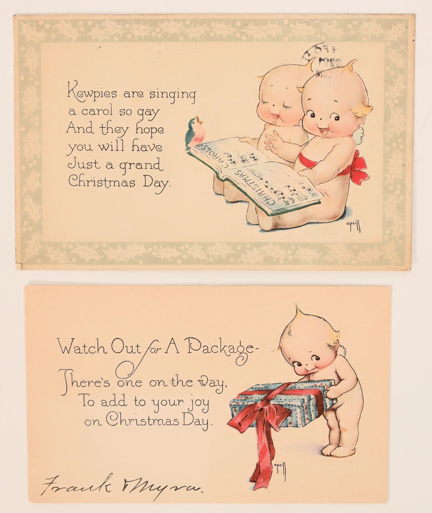 Pair of Christmas postcards featuring Kewpies, printed with signatures by the artist, Rose O'Neill. One postmarked 1928, the other unused.[