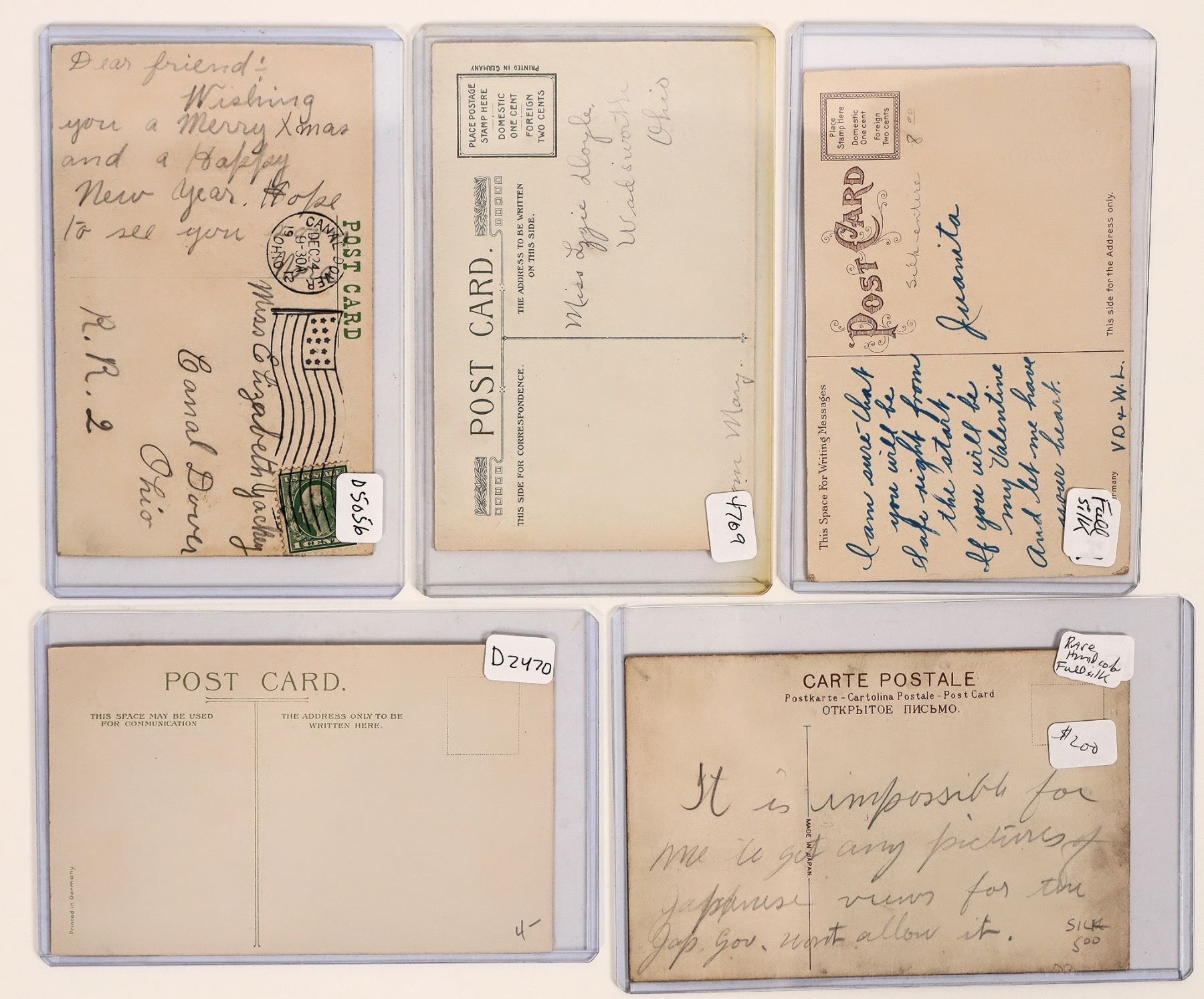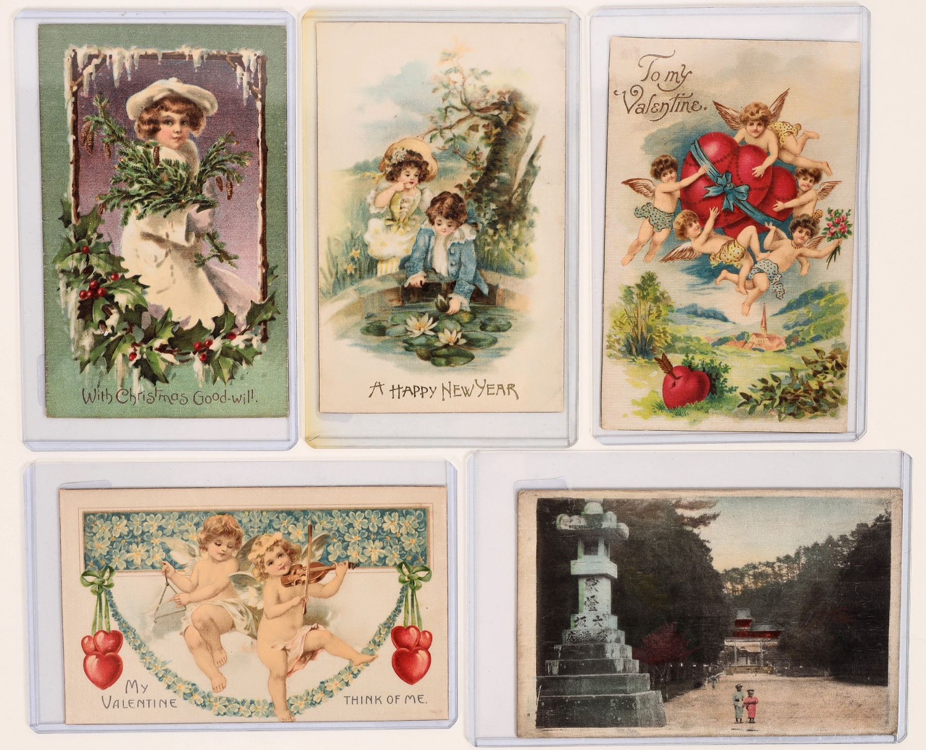 A collection of 5 postcards with mounted silk on them, c1912. One with a postmark, Canal Dover, Ohio, 1912; the others unused, some with penned writing on verso. Valentines (2), Christmas, New Year's and Japanese postcards.[