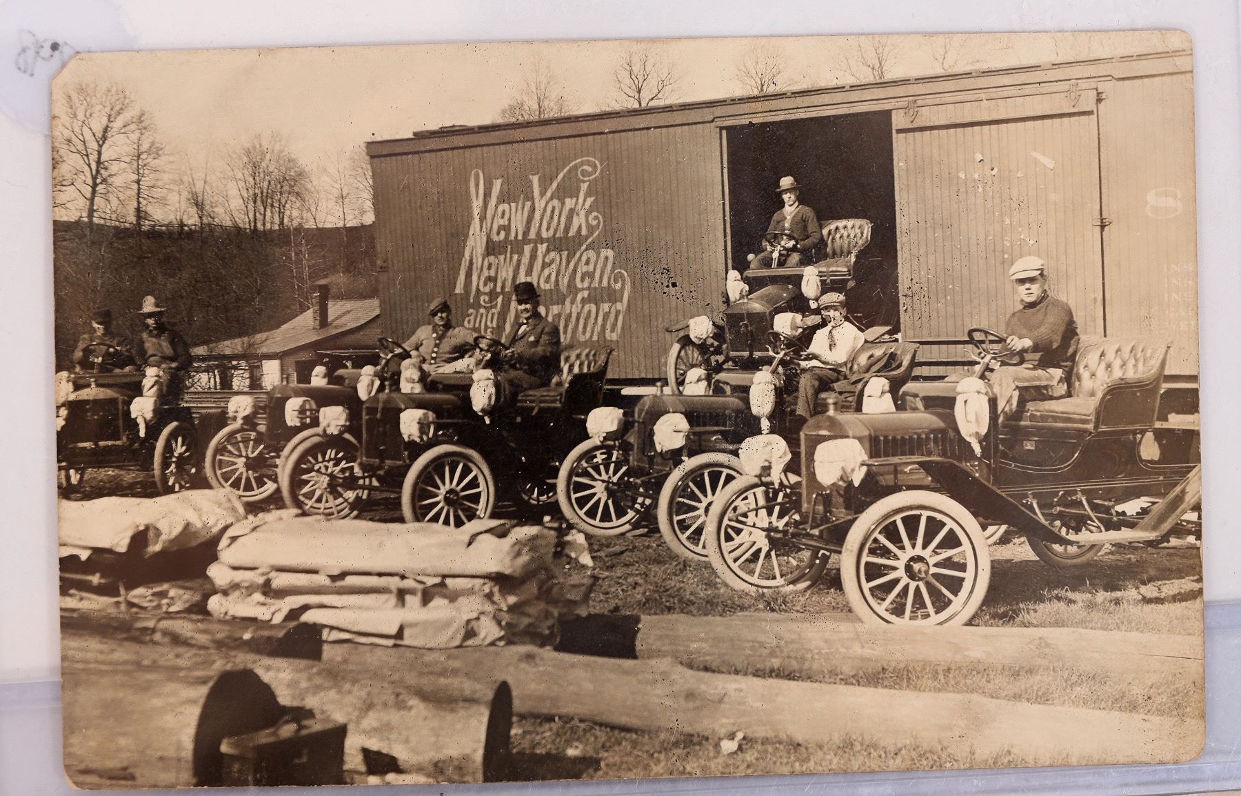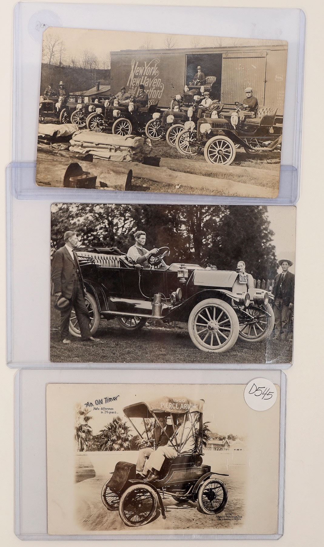 Trio of RPC postcards featuring photos of people in newly delivered new cars, c1900-10s. Includes a 1900 Pierce Arrow, Campbell's Photo Design Shop, Indianapolis, Ind. All unused.[