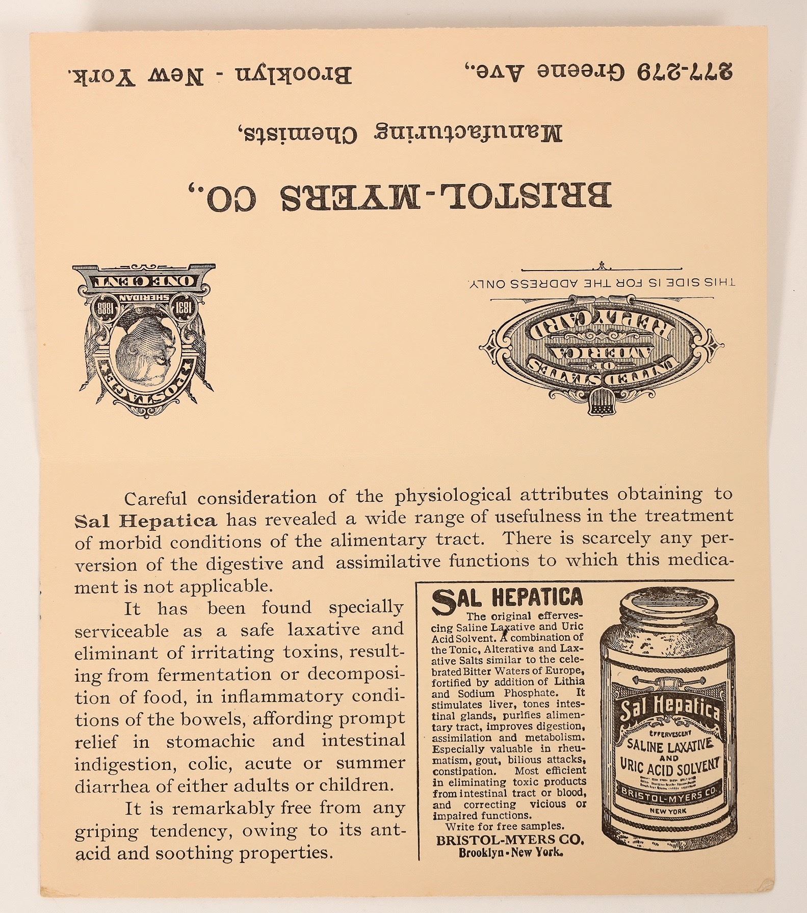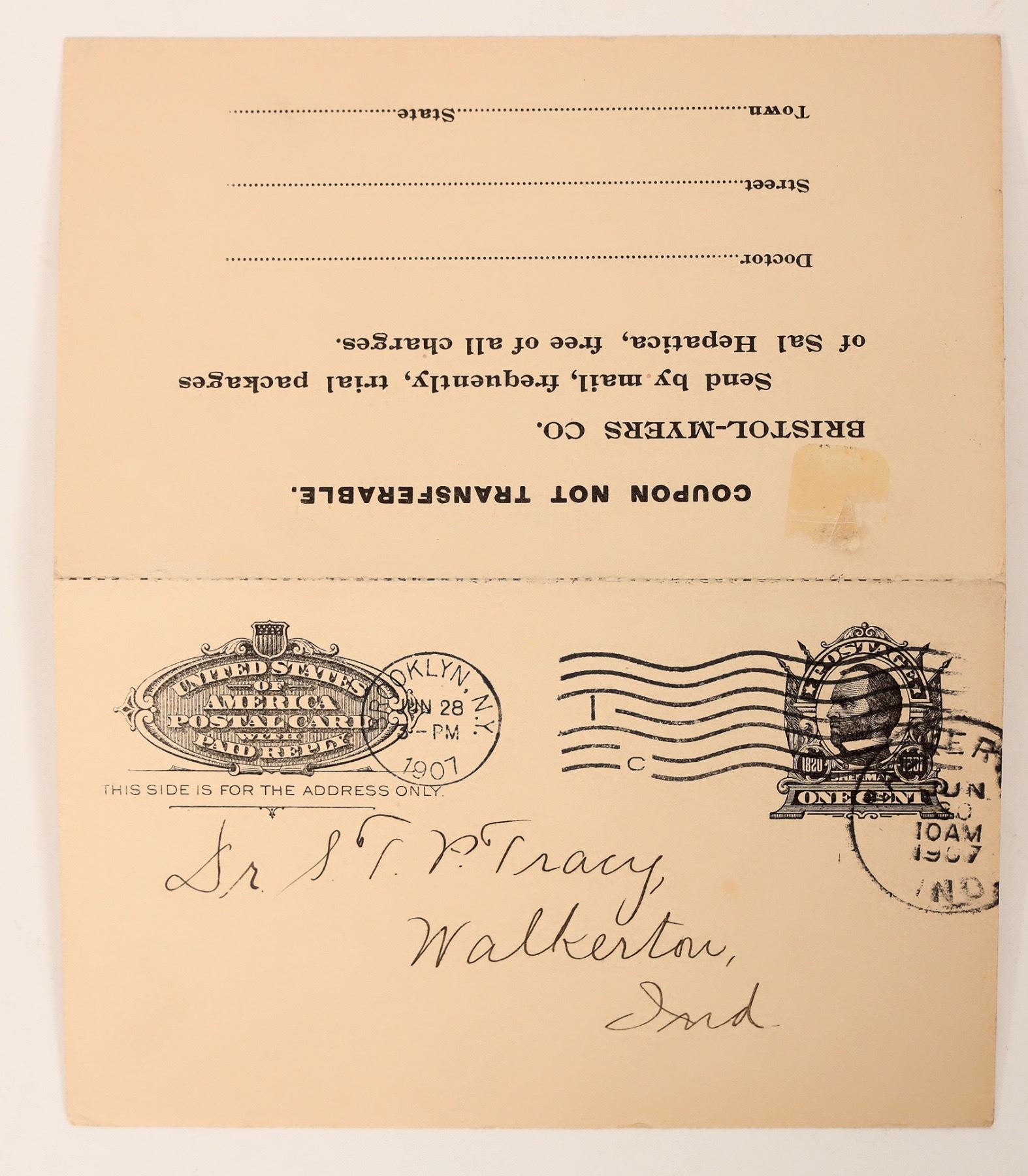 A RARE reply card pair, postcard with attached reply card for Bristol- Myers Co. in NY. Coupon for trial packages of Sal Hepatica. Postmarked 1907, Brooklin, NY and Walkerton, Indiana.[