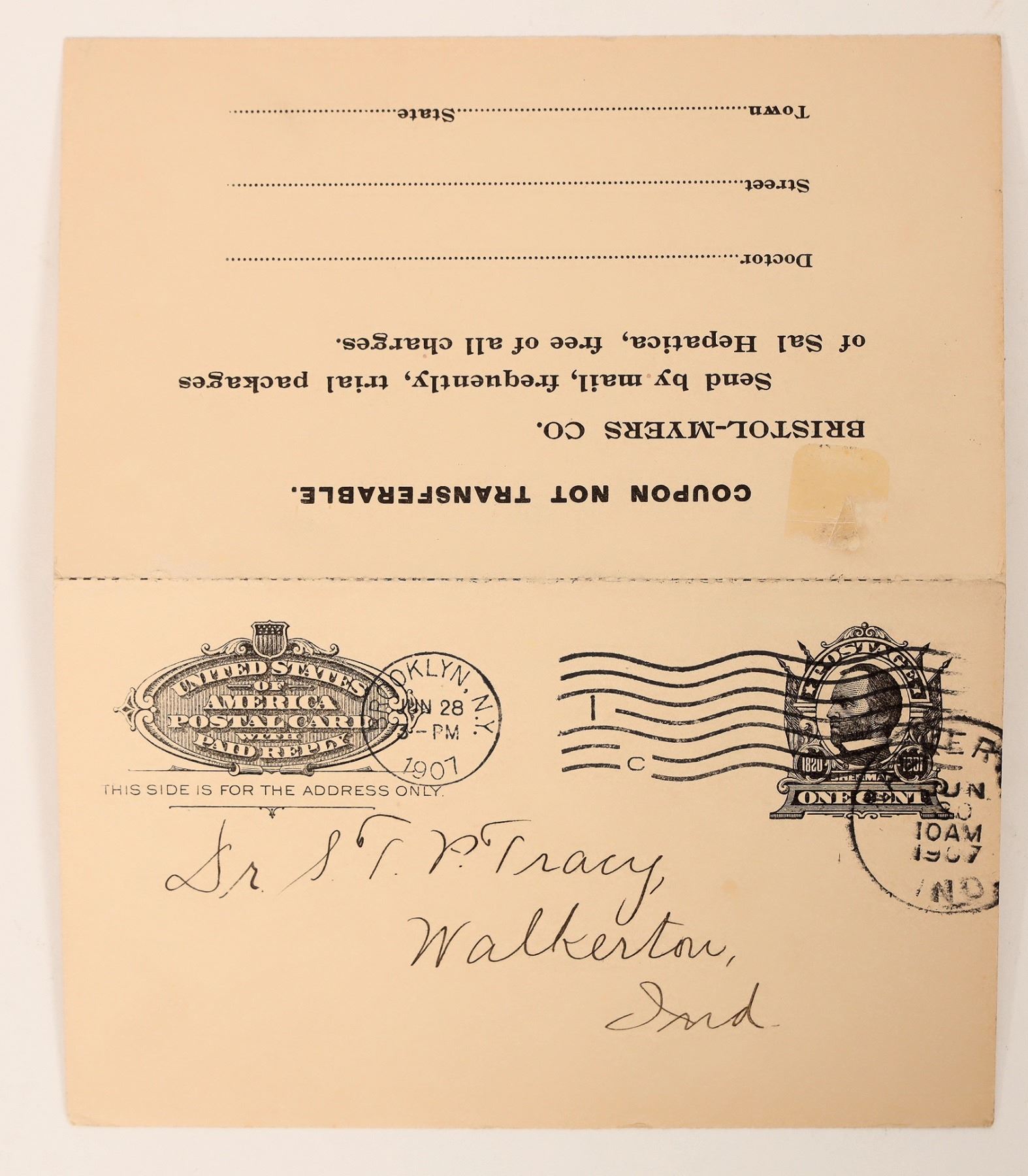 A RARE reply card pair, postcard with attached reply card for Bristol- Myers Co. in NY. Coupon for trial packages of Sal Hepatica. Postmarked 1907, Brooklin, NY and Walkerton, Indiana.