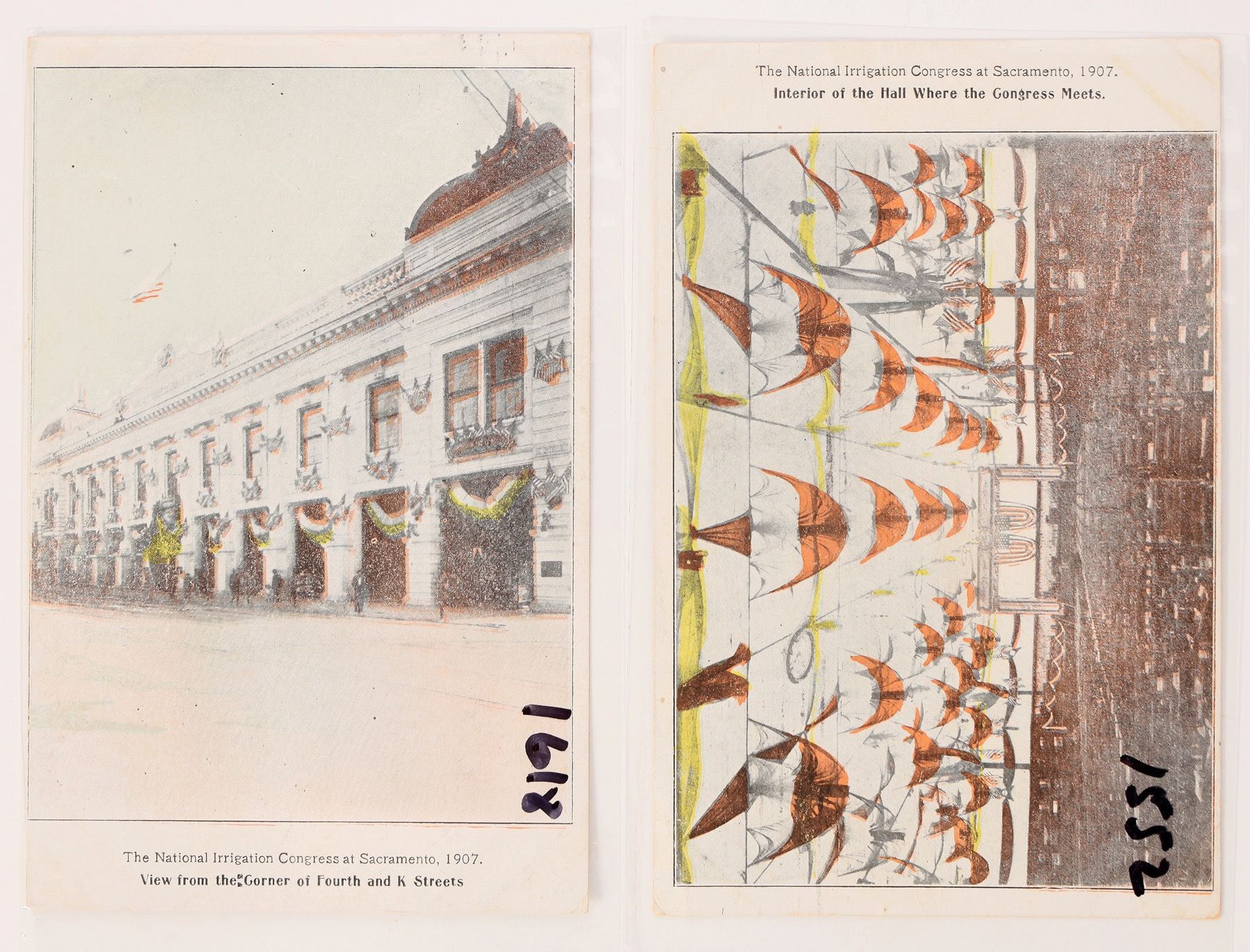 A pair of postcards depicting the National Irrigation Congress at Sacramento, c1907. Chromolithos. Both postmarked 1907 Sacramento.