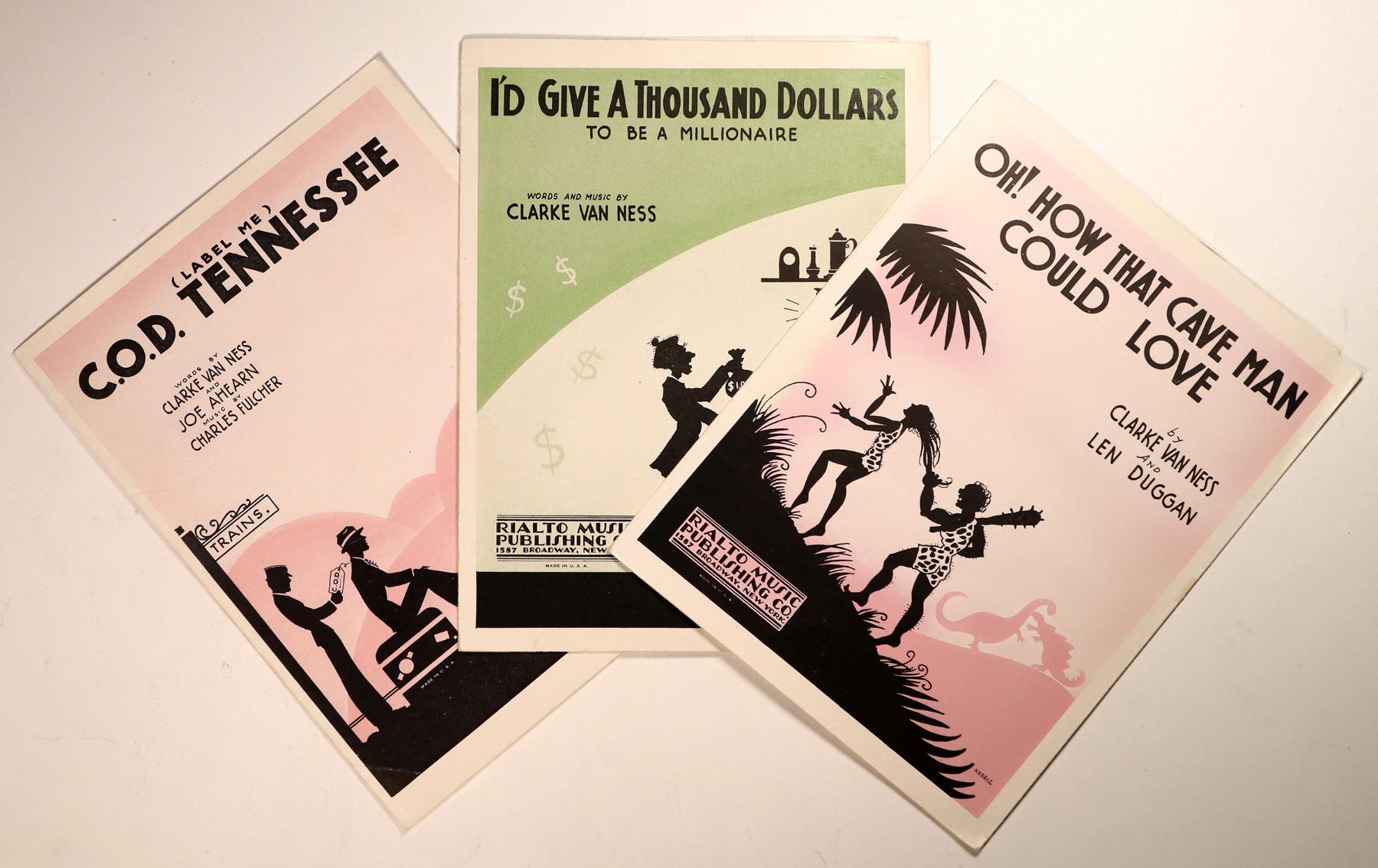 A collection of 3 folding postcards with sheet music inside. Copyright 1930 by Mercury Music Publishing Co., Inc. Copyright transferred, 1931 to Rialto Music Pub. Co. New York City. Unused postcards on the backs, sheet music covers on fronts, includes: "C.O.D. Tennessee (Label Me)," "I'd Give A Thousand Dollars to be a Millionaire," and "Oh! How that Cave Man Could Love." Words and music by Clarke Van Ness, Len Duggan, Joe Ahern and Charles Fulcher. Each folds out from 4" x 5.5" to 12" x 5.5," with sheet music and lyrics inside.