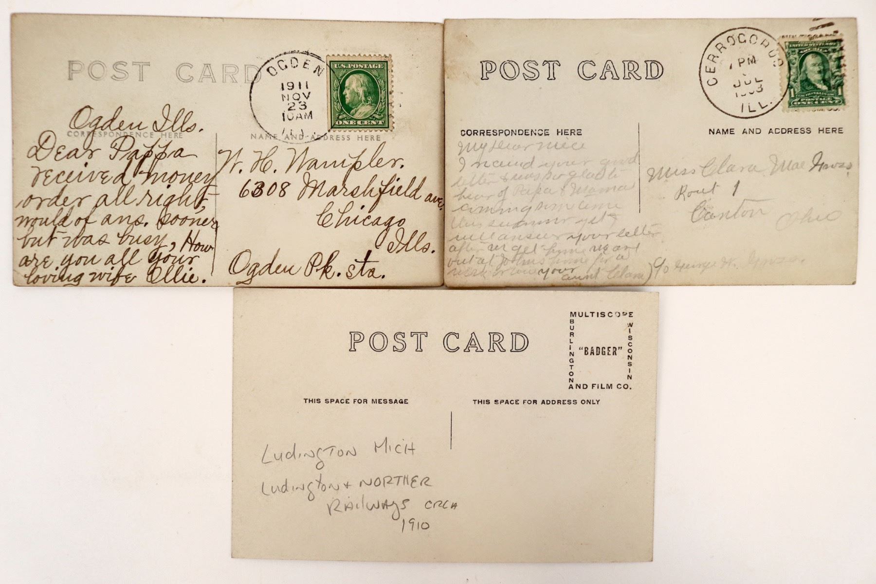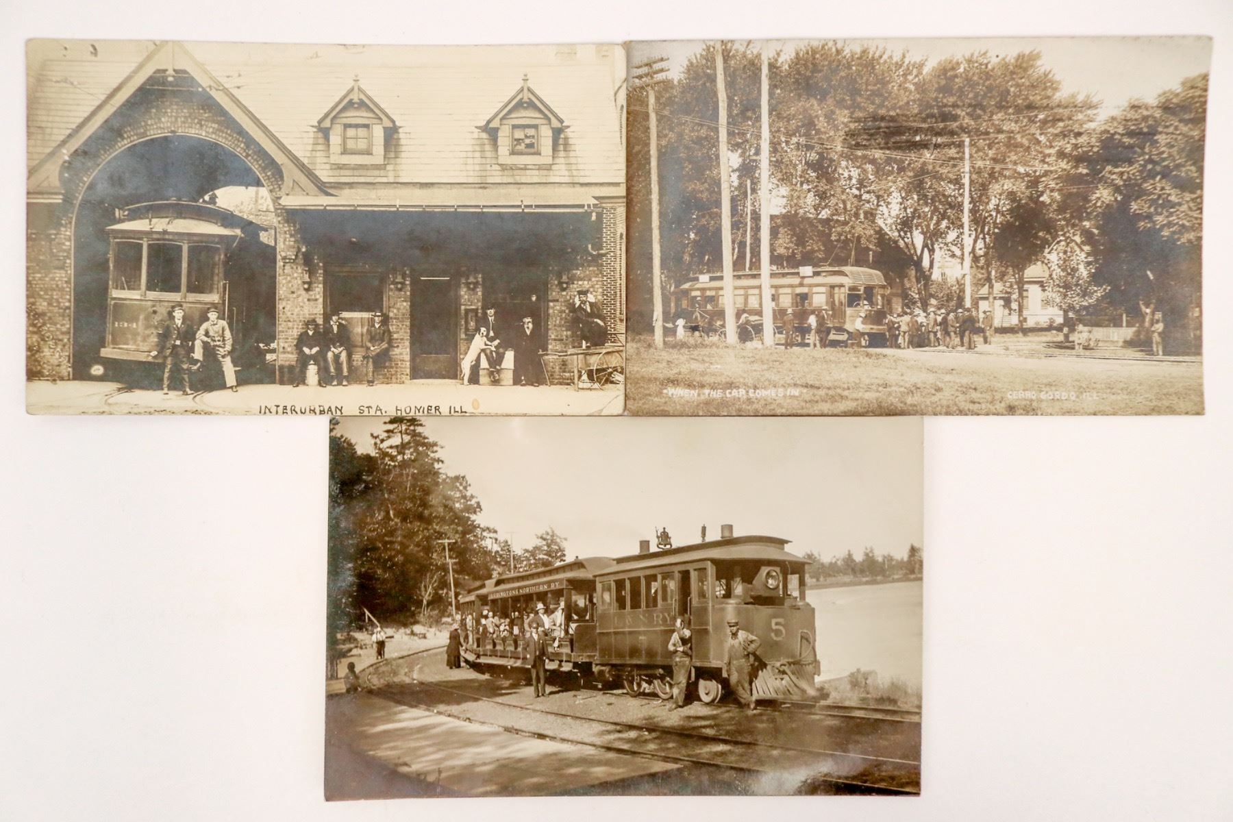 Trio of RPC postcards featuring street rail cars, c1908-10. Photos of: "When the car comes in, Cerro Gordo, Ill."; "Interurban Sta., Homer, Ill."; and "Ludington, Mich., Ludington & Northern Railways, c1910." Two postmarked Cerro Gordo and Ogden, Ill., the other unused.[