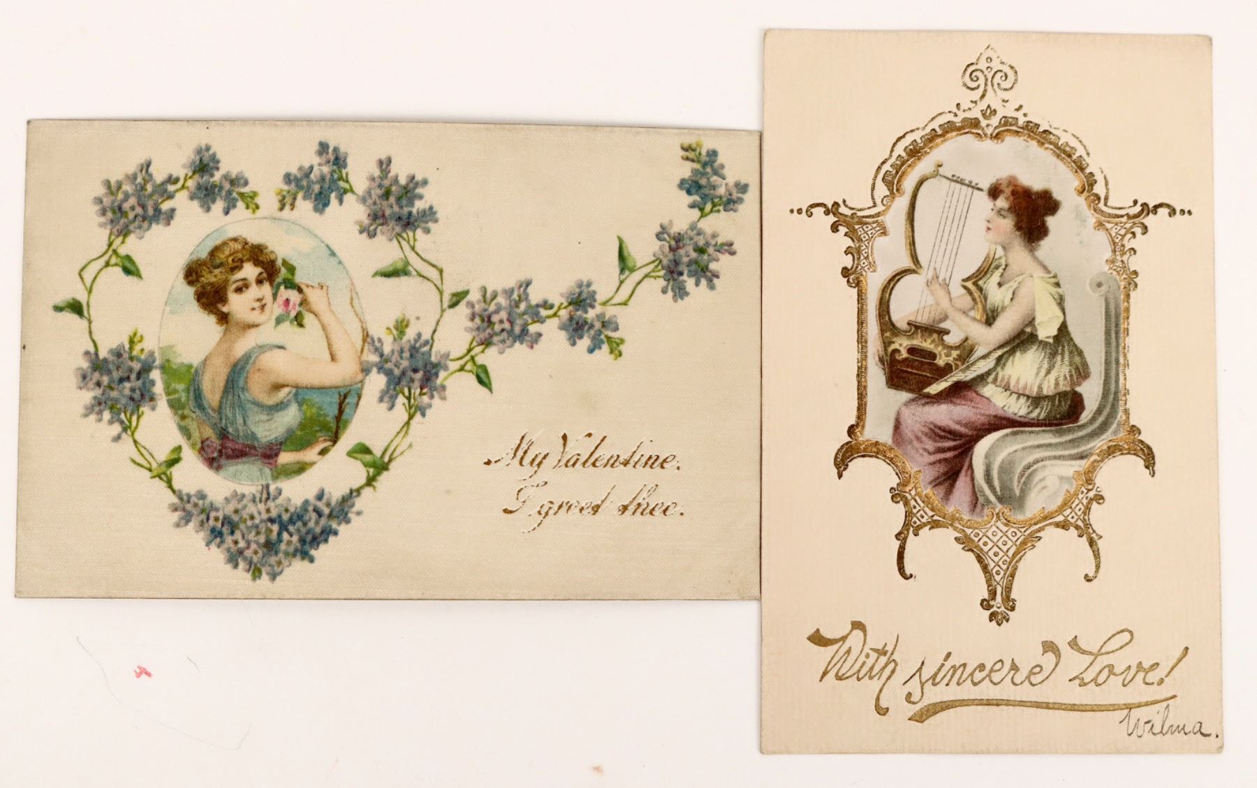 Pair of cameo-style Valentine postcards, c190X-12. One embossed, the other silk, both with gold gilt lettering. Possibly from same publisher. Both used, postmarked 1912, Cleveland and 190X?, Smoke Run, Pa.[