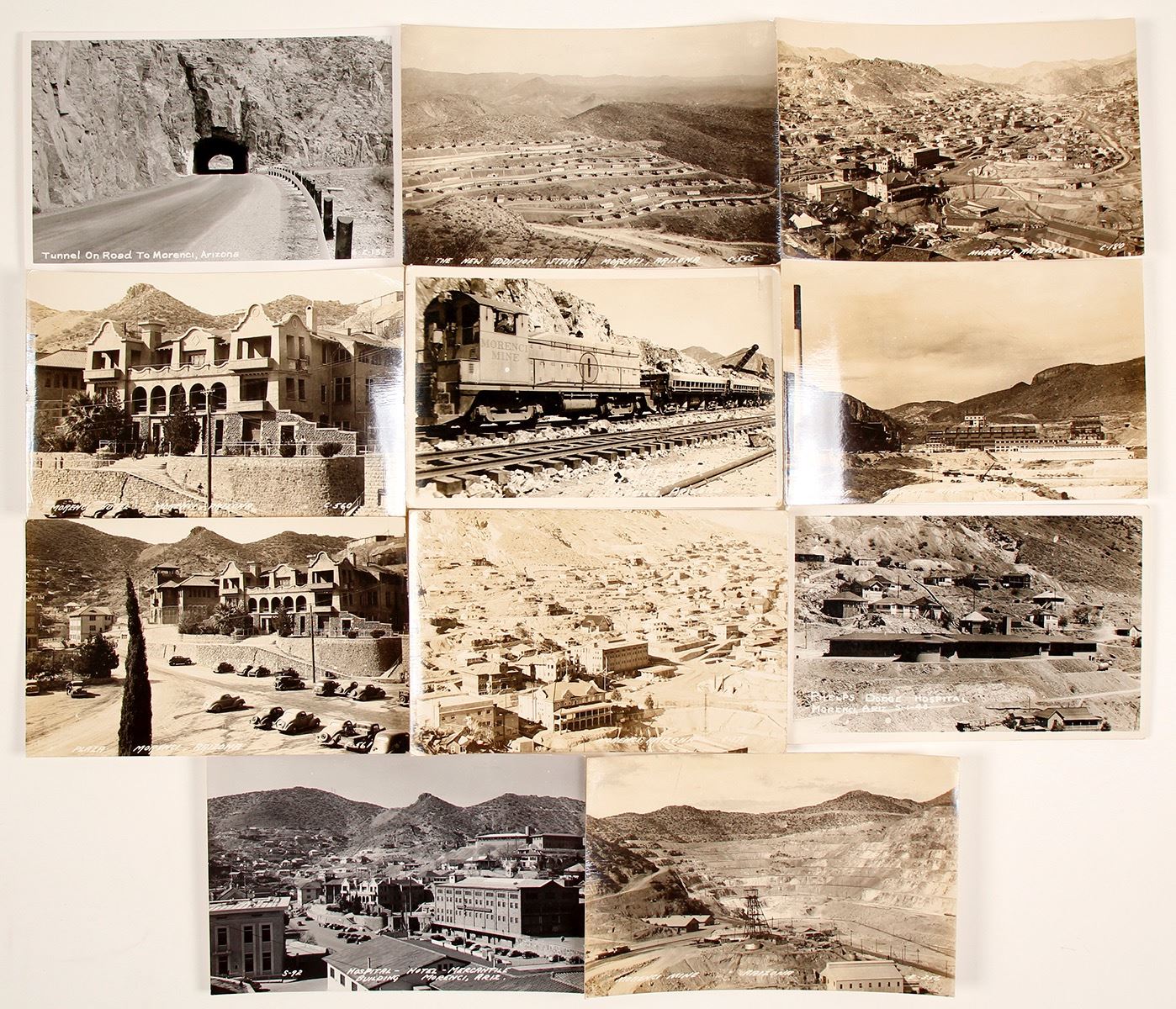 Lot of 11 postcards. The postcards show the images of Morenci's downtown including the Plaza, the Phelps Dodge Hospital, and the Morenci Hotel. There are also several mining of the Morenci Mine. No postmarks on any of these postcards. Date: Ca. 1930 Location: Morenci, Arizona HWAC# 63821