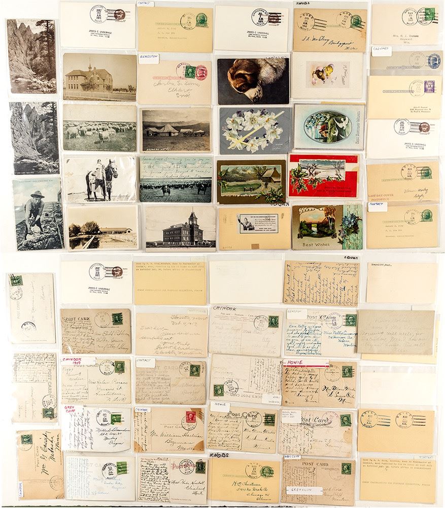 Five RPC's: Big Timber School, Bruneau (tent) hotel, Indian girl on horse (postcard in poor condition), Big Timer Fish Hatchery, sheep herd. Four picture postcards: Sheep Creek Canyon, sheep herd, sheep shearer. Fallon County 5: 1915 Bisher (1914-1918), Calumet, Knobs. 1915 Dennis. Sweetwater County 14: three c1910 Howie, 1917 Glasston, Contact, Greycliff, Blaine County 7: Chinook, 1915 Dennis. (Svoboda Collection) City: Fallon, Blaine, Sweetwater Counties State: Montana Date: HWAC# 35551