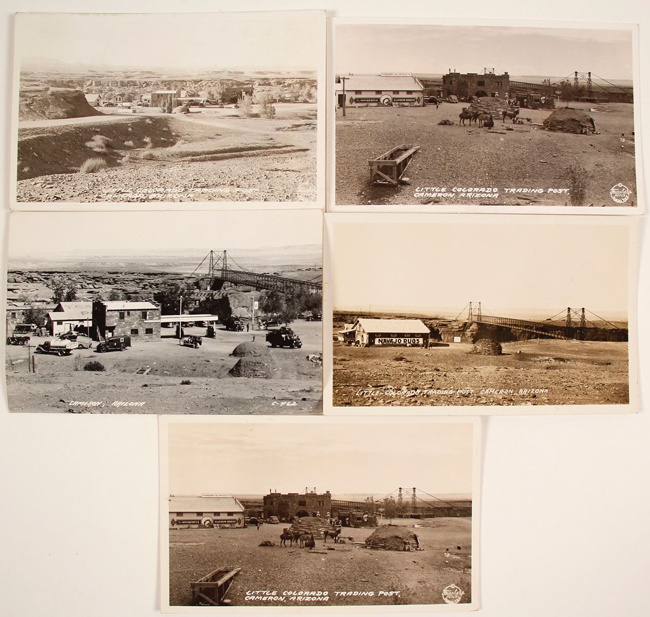 Lot of 5. 1) Little Colorado Trading Post. Published by Frasher's Foto Inc. RPC. No postmark. 2) Little Colorado Trading Post. Published by Frasher's Foto Inc. RPC. Postmark 1936. 3) View of Cameron. Published by the L.L. Cook Co. 4) Little Colorado Trading Post. Published by Frasher's Foto Inc. RPC. No postmark. 5) Little Colorado Trading Post. No photographer identified. RPC. No postmark. Date: Location: Cameron, Arizona HWAC# 63812