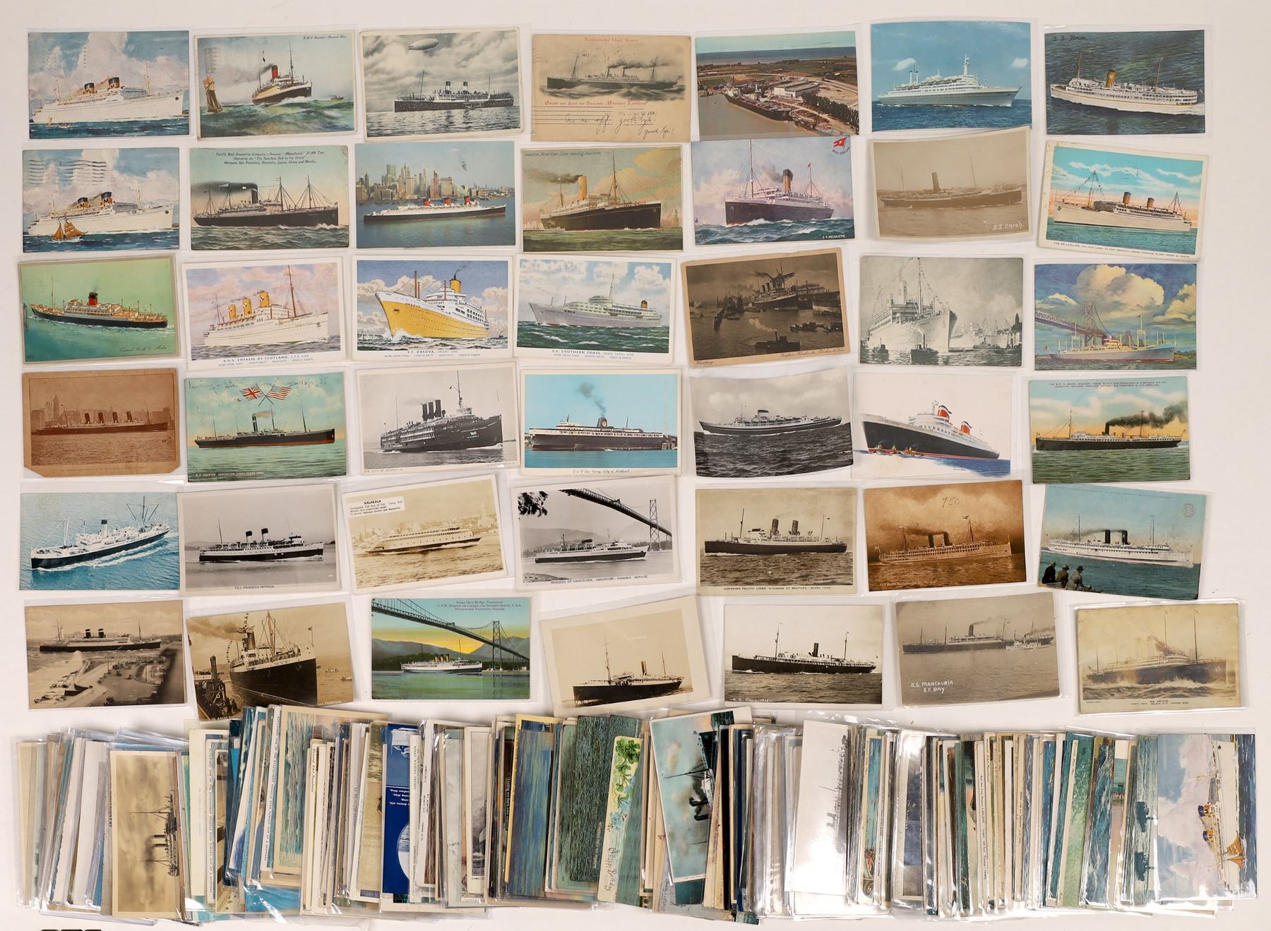This is a collection of about 300 postcards depicting cruise ship vessels from around the world. Exterior views, many are RPCs. Lot includes an artist's rendering of the Lusitania.