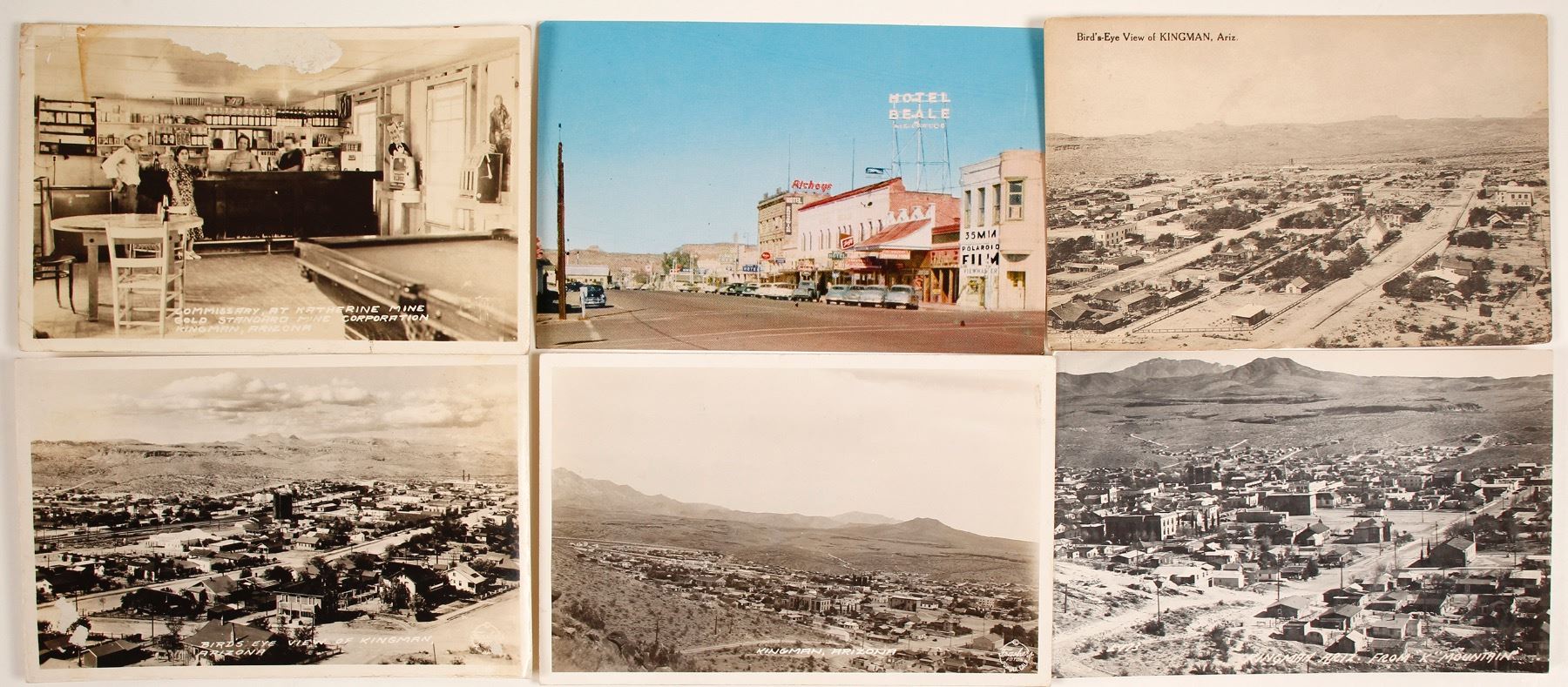 Lot of 6. 1) Highway 66, through Kingman. No postmark, but there is writing on the back on the postcard. Produced by Frye and Smith Ltd. 2) Commissary at Katherine Mine Gold Standard Mine Corporation. RPC. Postmarked 1939. Produced by Frasher's Inc. 3) Birds eye view of Kingman. No postmark, but dated January 20, 1945. Produced by Frashers Foto. RPC. 4) Birds eye view of Kingman. RPC. Produced by Frashers Foto. RPC. No postmark. 5) Birds eye view of Kingman. RPC. No postmark. Produced by L.L. Cook Co. 6) Birds eye view of Kingman. Postmarked but date unknown. RPC. Date: Location: Kingman, Arizona HWAC# 63811