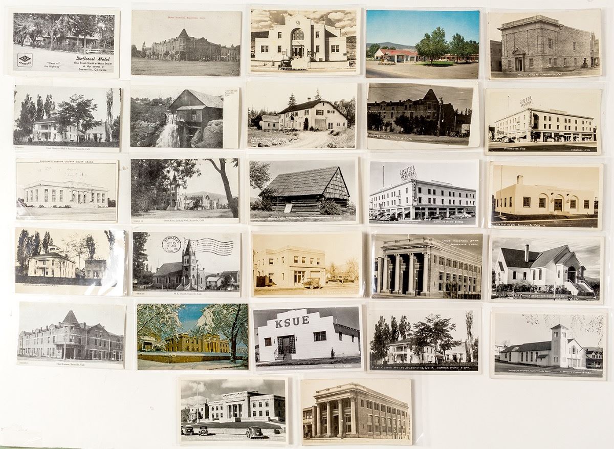 Lot of 27. Seventeen are real photo: Emerson's Hotel (mailed 1914), Lassen Industrial Bank, Court House, Catholic church, LDS church, Post Office, Hotel Mt. Lassen (mailed 1935), Masonic Temple, First Court House, Memorial Building, Radio Station, City Hall, Roop's Fort, and Hospital. Photos by Eastman and Thompson. Also, ten printed cards, eight mailed (1909-1962). (Prag Collection) State: California City: Susanville Date: FHWAC#: 34946