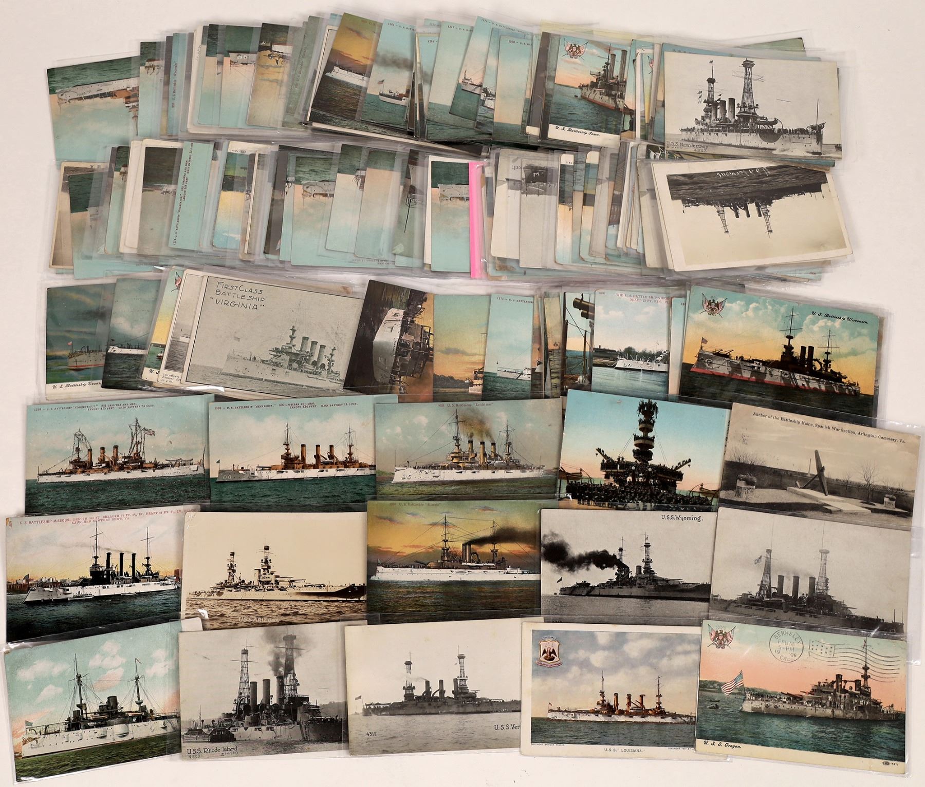 This is a collection of U.S. battleships. A count of over 150 including dups. Many are chrome lithographed, others RPCs. This is naval history at your fingertips. The ships include: the Arizona, Kentucky, Oregon, Illinois, Missouri, Ohio, Wisconsin, Georgia, Rhode Island, Virginia, Nebraska, Minnesota, Iowa, Texas, Louisiana, Connecticut, Vermont, New Jersey, and Frederick. Please see photos for details.