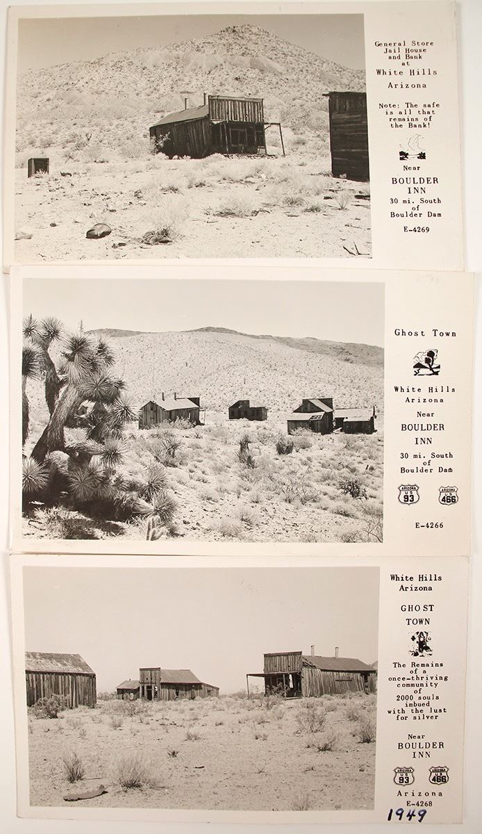 Lot of 3 postcards from the ghost town of White Hills. 1) General store, jail house, and bank. RPC. No postmark. Frashers Foto card, but produced by Lollesgard Specialty Co. 2) Another town view of White Hills. RPC. Postmarked 1950. Frashers Foto card, but produced by Lollesgard Specialty Co. 3) Another town view of White Hills. RPC. No postmark. Frashers Foto card, but produced by Lollesgard Specialty Co. Date: Ca. 1949 Location: White Hills, Arizona HWAC# 63813