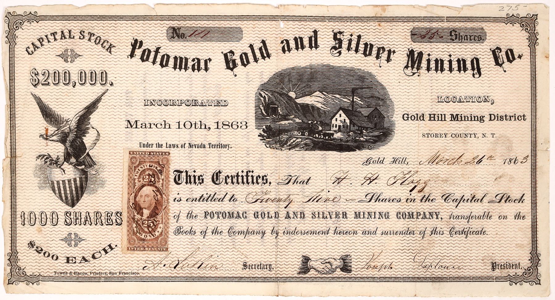 Potomac Gold & Silver Mining Co. Gold Hill Mining District, Storey County, N.T. Issued to H. H. Flagg, for 25 shares datelined Gold Hill on March 26th, 1863. Signed by Joseph Laflower as president and A. Luskin as secretary. Flagg was an important Gold Hill banker who went broke and was helped by editor Alf Doten. Incorporated March 10, 1863, and capitalized at $200,000; 1000 shares at $200 per. Vignette of a mining scene by Loomis at top center, one of his usual wood cuts. Large eagle at left. Pink underprint. 5.5 x 10". Very thin paper and delicate. Left edge is a bit ragged. Small hole at top center. 25-cent bond adhesive revenue attached. Gold Hill Nevada Franklin Collection