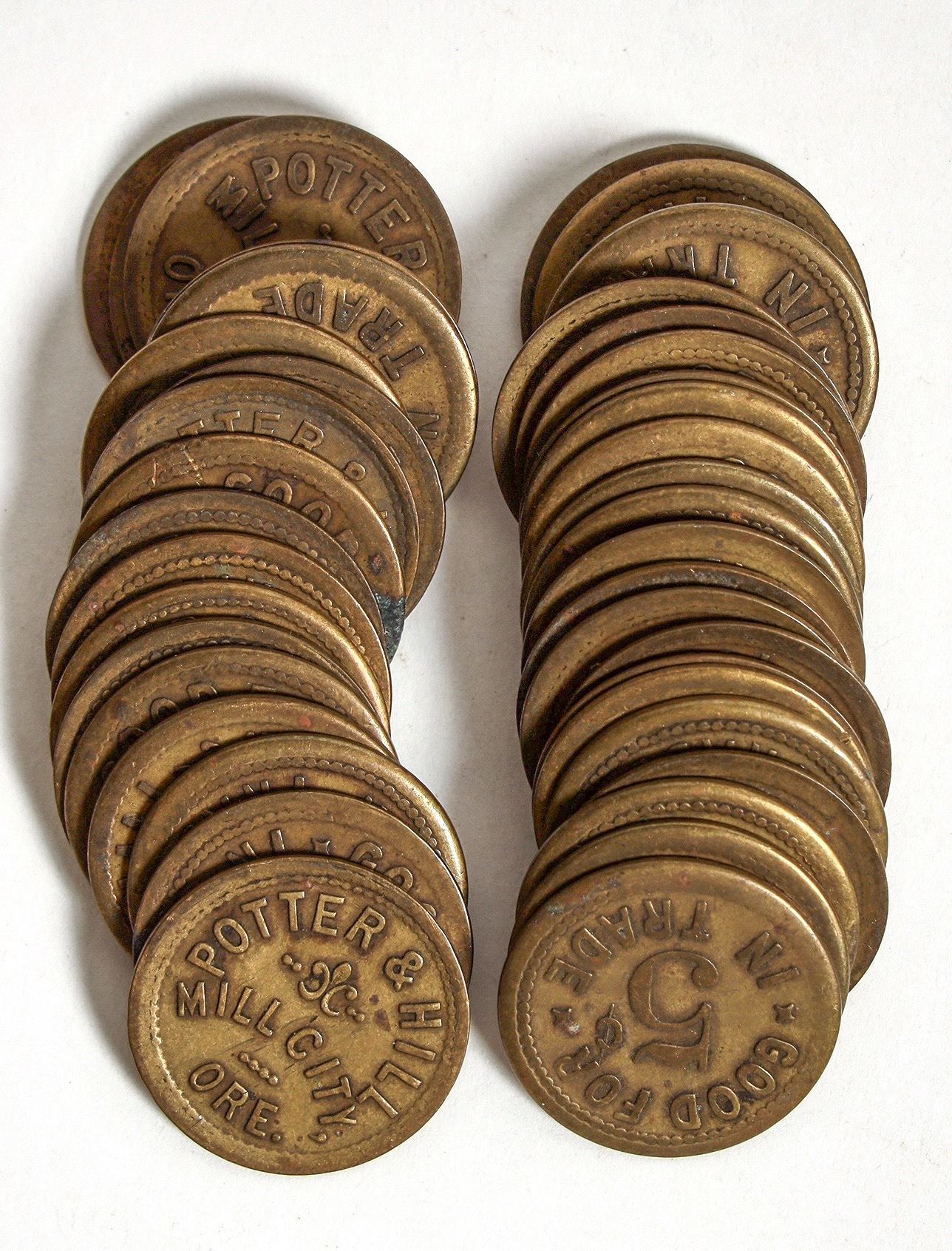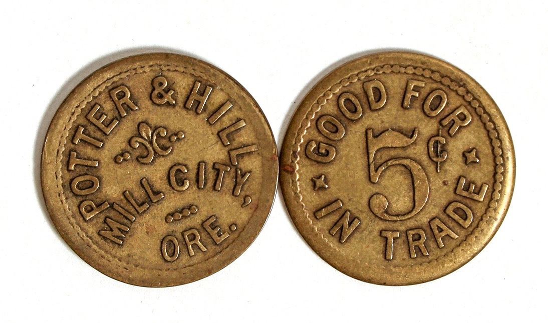 From the Marion County town of Mill City: 40 tokens: POTTER & HILL / MILL CITY, / ORE. // GOOD FOR / 5¢ / IN TRADE; Br., rd., 21 mm.[ Mill City Oregon