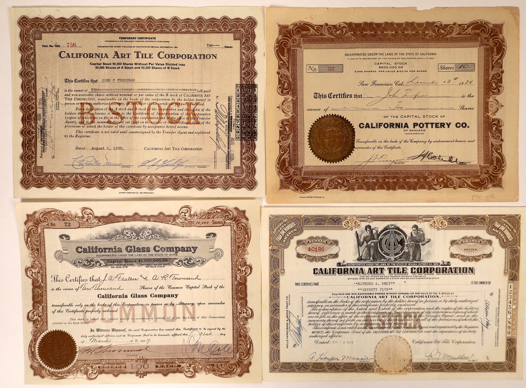 Four pottery, art, tile and glass company stock certificates from CA, NV and Maine, c1924-1955. Included are: California Glass Company, inc. ME, No. 72, 10,000 shares issued March 31, 1927, to J.A. Fraters and A.R. Townsend, signed by President and Secretary, uncanceled, brown ornate border and embossed seal, fine condition with two minor folds; California Pottery Co., inc. Oakland, CA, No. 37, 10 shares issued Dec. 13, 1924, to John Faufner, signed by President and Secretary, uncanceled, brown ornate border and embossed seal, good condition with some wear on edges and two minor folds; California Art Tile Corp., inc. NV, No. A0186, 75 shares issued Nov. 2, 1955 to Raymond A. Broy, signed by President R.J. Maddox and Secretary A. Harper Massie, canceled, brown ornate border, Greek vignette of two men, fine condition with two minor folds; California Art Tile Corp., inc. NV, No 756 (temporary certificate), 10 shares issued Aug. 2, 1935 to John F. Finnegan, signed by President and Secretary, uncanceled, brown ornate border, fine condition with two minor folds.