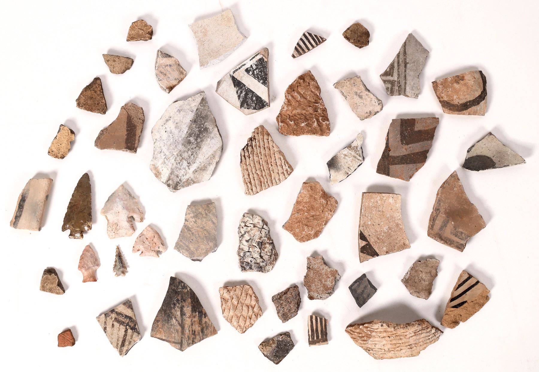 This lot holds over 30 pieces of pottery shards from the Bracken collection that have not been cataloged by location. There is black on white, black on red, twining method, and several substrate pieces. Clearly these pieces may not have come from the same location. There are five points: a Hardin point at 2.5 in./ 64 mm; a Single Barb point from Stone Co. Missouri; a Sequoyah point at 1.125 in./ 29 mm; a bird point from the Caddoan era 900 A.D. to 1200 A.D.; a Baker Creek point at 1.25 in./ 32 mm. From the Bracken collection. Please see photos for details.