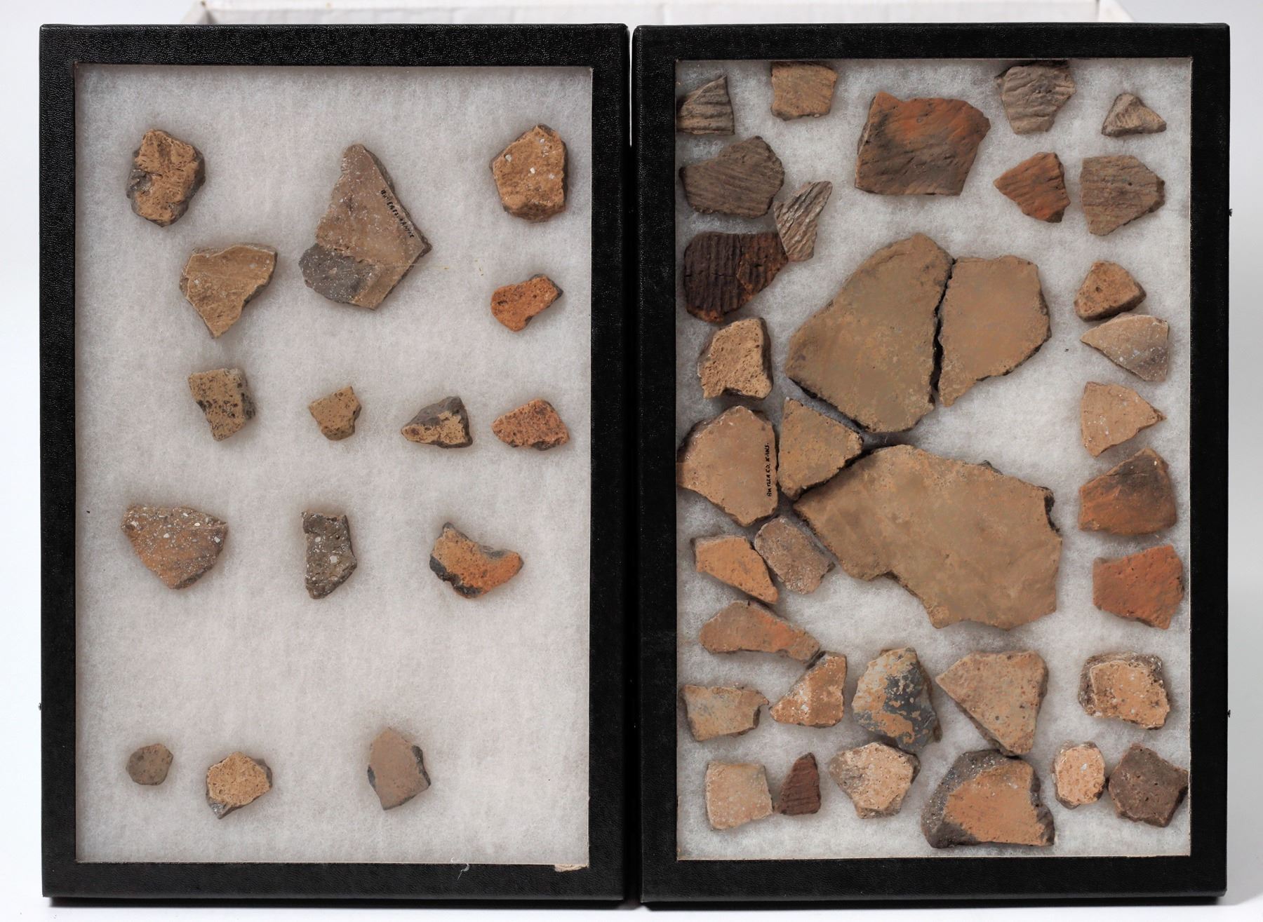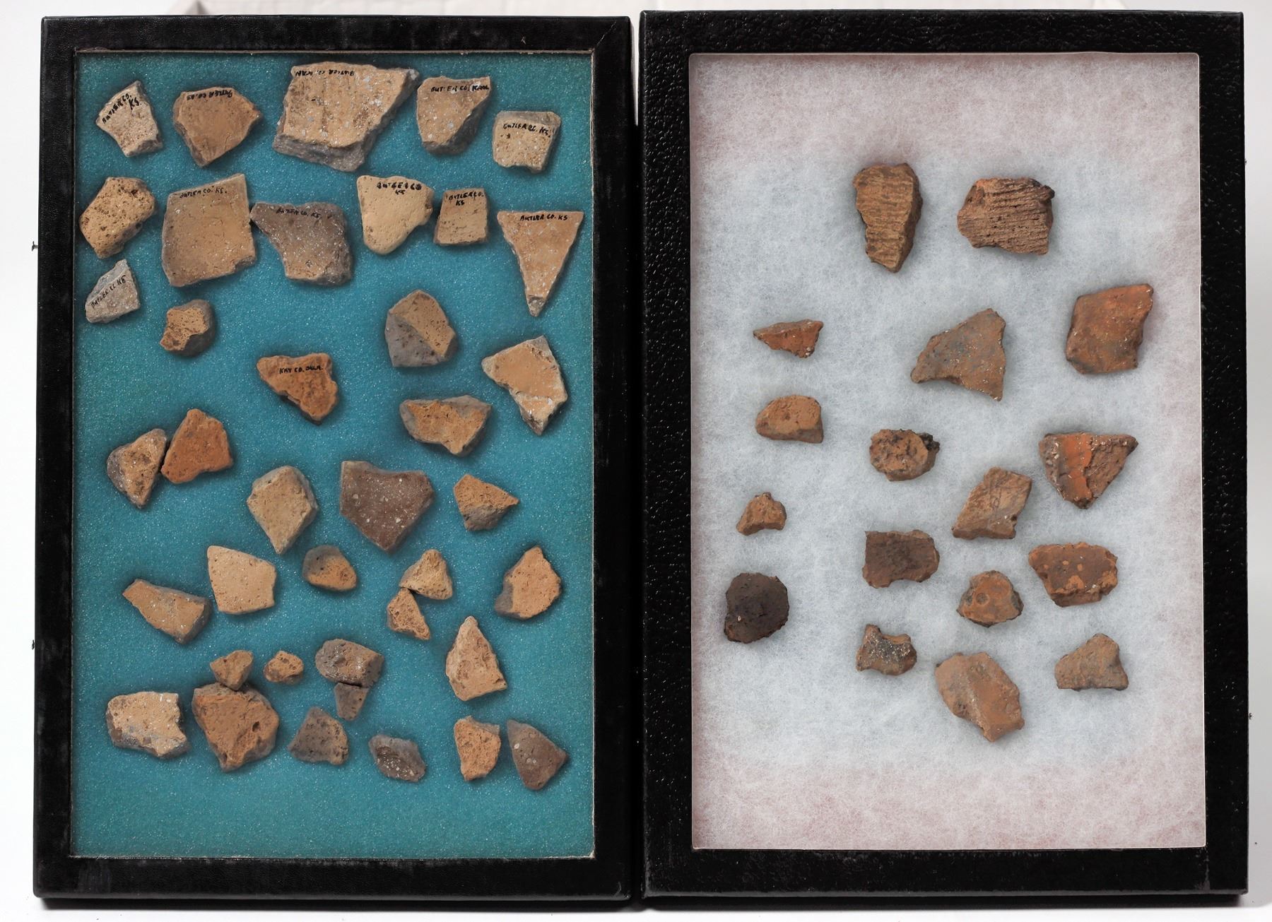 This lot contains four Riker boxes of pottery shards made and found in Kansas; a total of over 100 pieces. No known dates applied to this group. Please see photo for details. From the Gary Bracken collection.