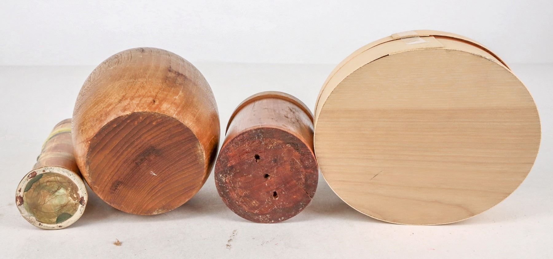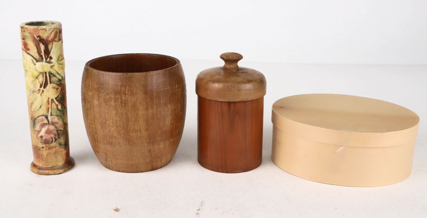 Pottery and Vintage Wood Containers. Old pottery painted vase, looks like Ohio Roseville. Not marked. Painted redware dishes marked Mexico, vintage 1970s. Wooden handmade vintage containers.