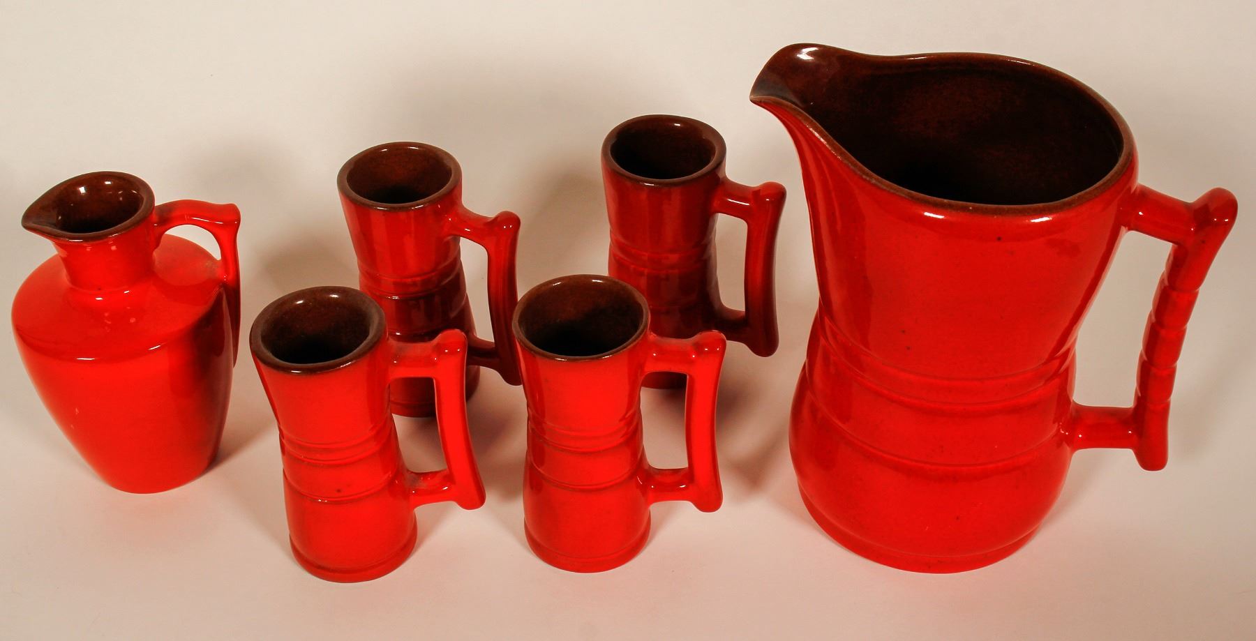 Frankoma 1 Pitcher, 1 Small Jug & 4 cup set contains: Pitcher marked Frankoma 26 D (7" tall"), & Small jug marked Frankoma 838; 4 cups marked Frankoma 26DC (4.5" tall"). At least 25 yrs old, all in beautiful condition. They are red/brown color. This would make a great addition to your collection. City: State: Oklahoma Date: