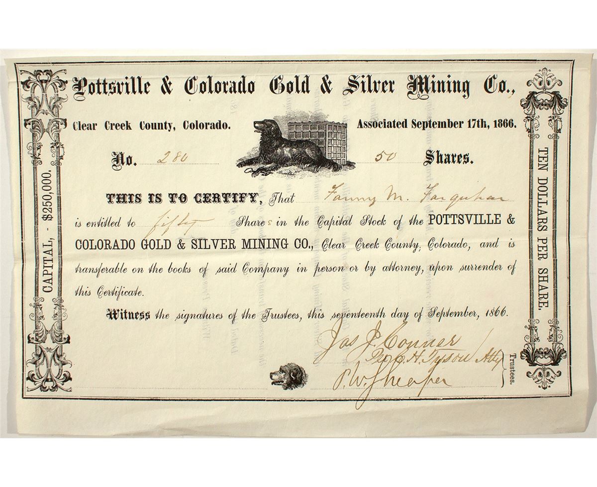 Very early Colorado stock certificate. Number 280 for 50 shares to Fanny Farguhar(?) in September of 1866. Signed by James Conner per CH Tyson and PW Sheaper. Vignette of a large dog guarding a crate. This company was located in or near Georgetown.