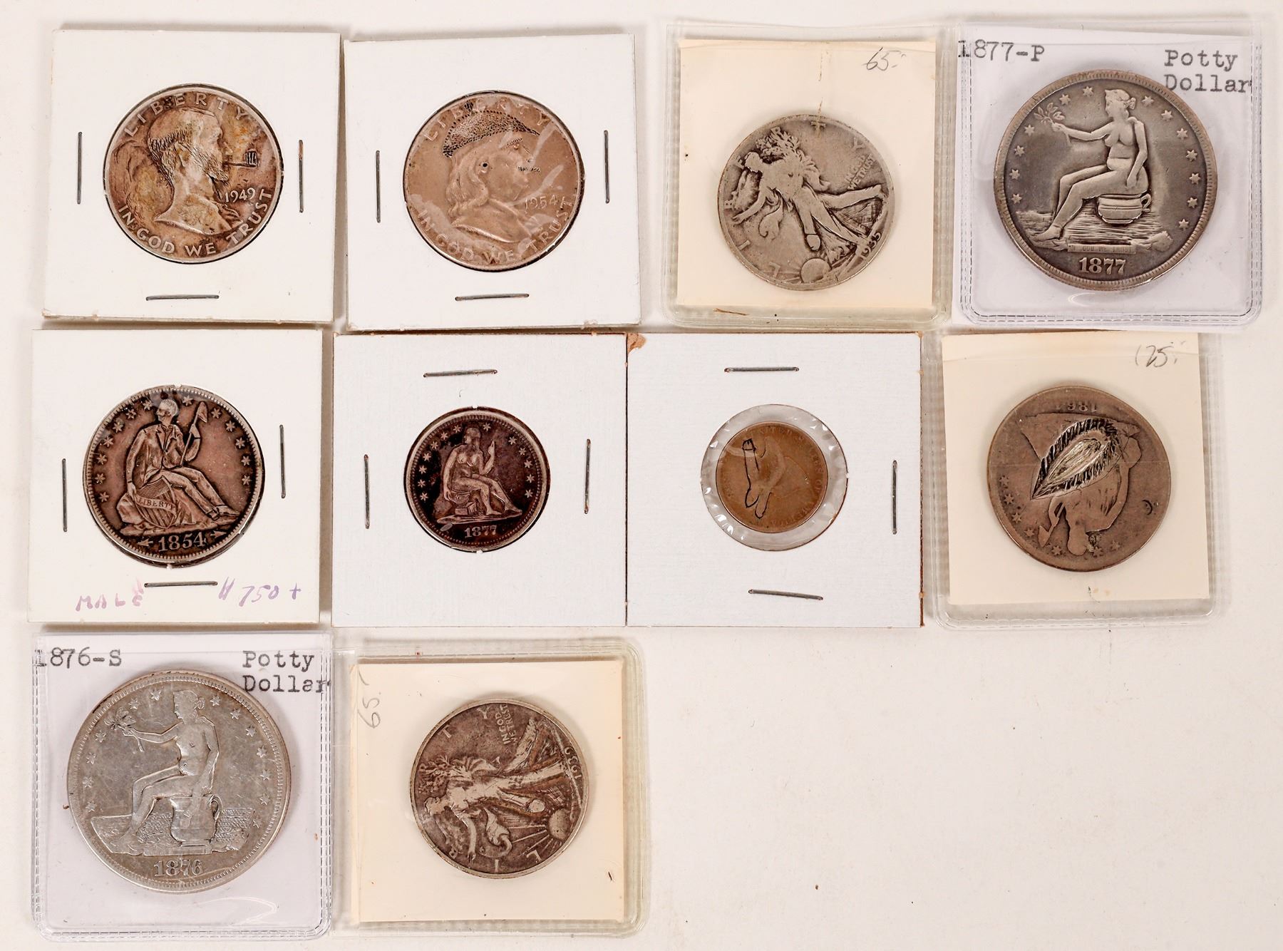 Lot of ten potty coins: 1) Flying eagle cent (and the eagle is excited); 2) 1877 Liberty squatted quarter; 3) 1864 Liberty Seated half with a leaf embossed; 4) 1854 seated half carved as a male on the seat, and an "S" mint mark scratched on the reverse; 5) 1949 endowed Walking Liberty half dollar; 6) 1935 endowed Walking Liberty half dollar; 7) 1949-S hobo Franklin half dollar (hair, a beard and a pipe); 8) 1954-S hatted Franklin half dollar; 9) 1877 trade potty dollar; 10) 1876-S trade potty dollar.