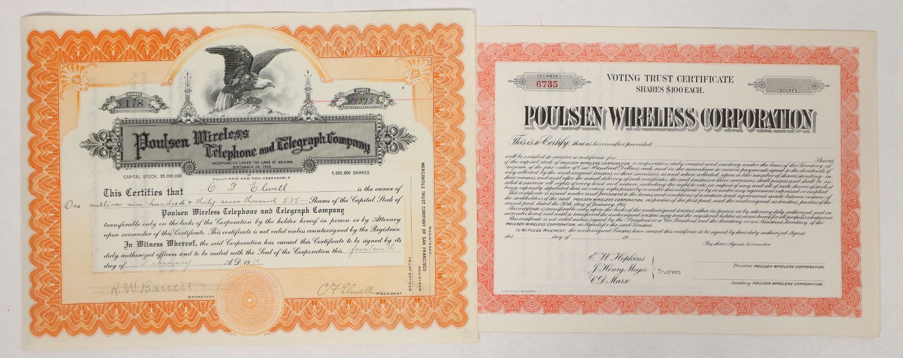 Issued 1910 and unissued Poulsen Wireless stocks.