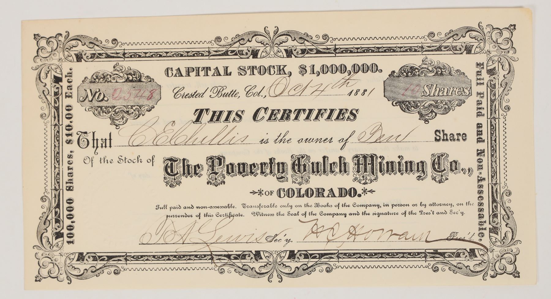 Very rare. Dateline Crested Butte, Col., Oct. 4th, 1881. No. 2548, issued for 10 shares to CE Chillis. Signed by president Howard and secretary Lewis. Not cancelled. Black border and print, no vignette. Folds. Not listed in C&L. According to the Gunnison Daily News (July 8, 1882), the Poverty Gulch Mining Company was doing "considerable work" in Poverty Gulch, Gunnison County. They owned 7 claims, including the Good Enough. In 1883, they were reported to have spent a large amount of capital developing the Burpee and other claims.